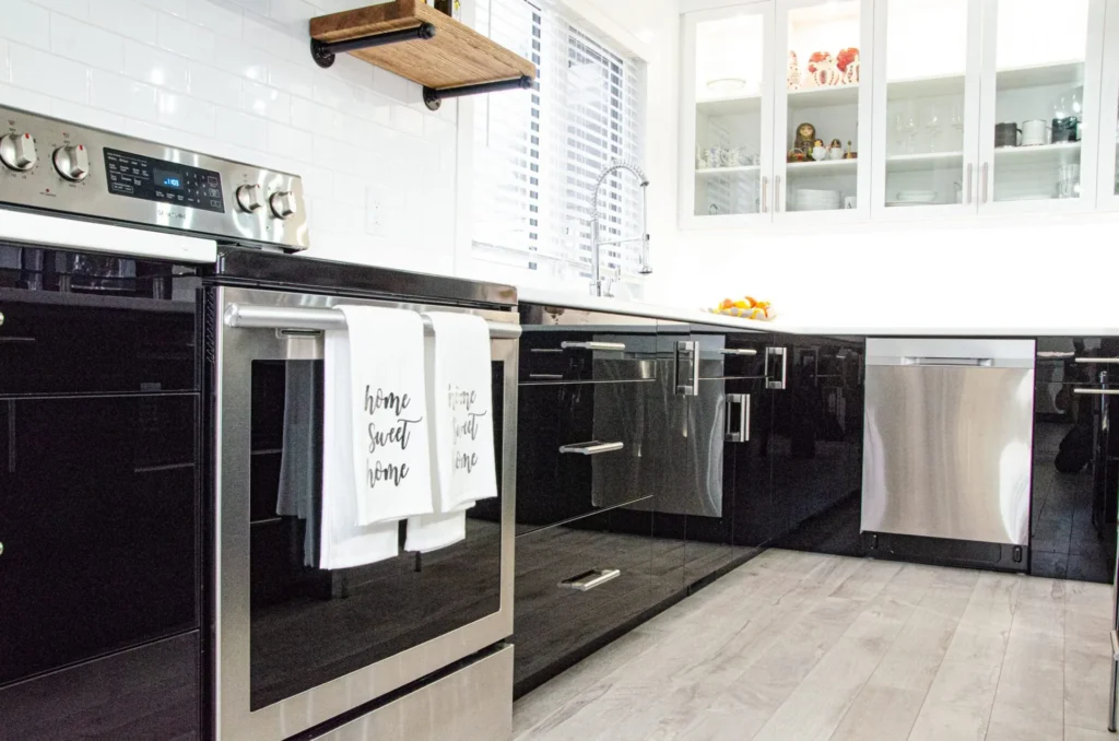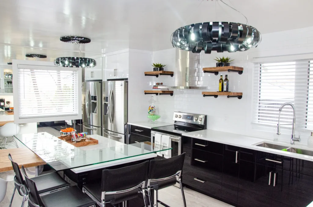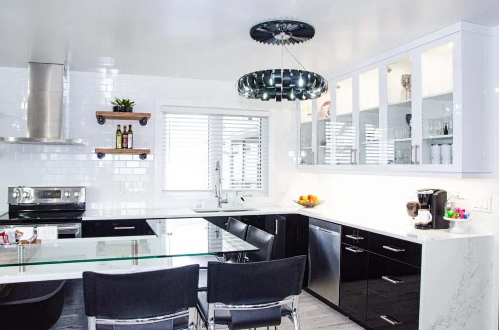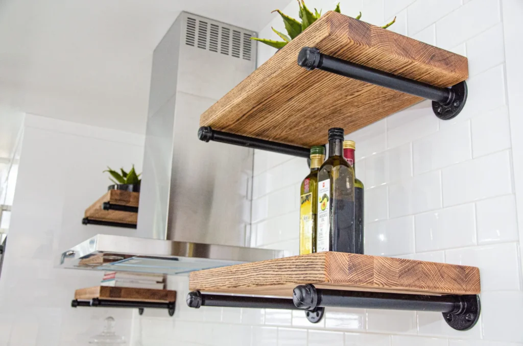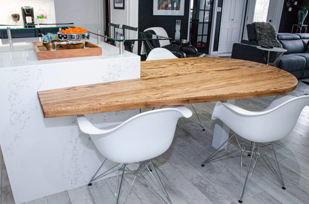 A modern and sleek kitchen warmed up with a unique Oak island, the Adams kitchen reno is in a category of its own. Features like the glass-top bar and industrial floating shelves give this space an eclectic feel while bringing harmony to the home.
