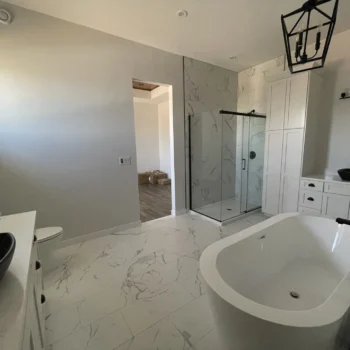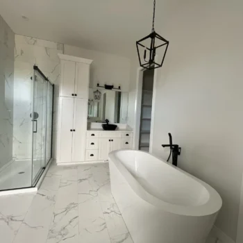 • Fully tiled ensuite fit with his-and-her walk-in closets, in Ames Verona Carrara White tile