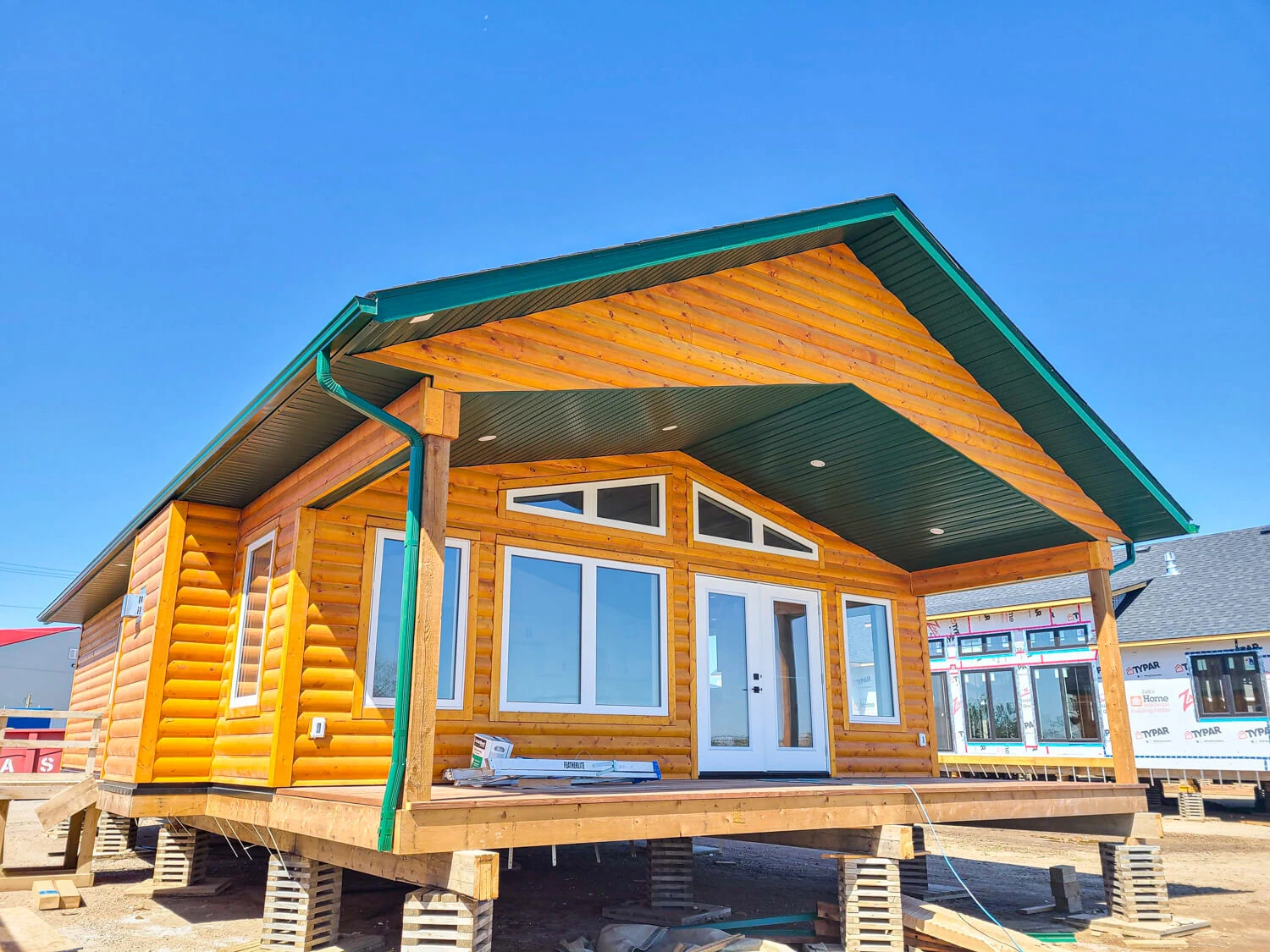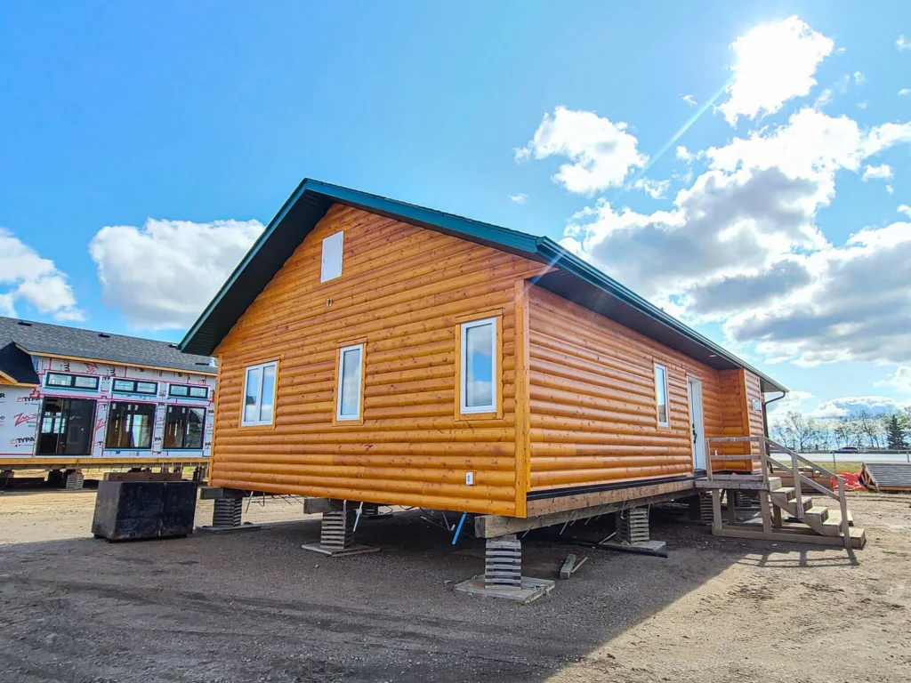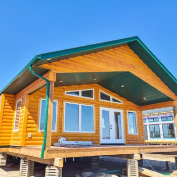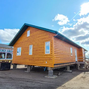 Based on our Smoothstone model, this rustic-style prefab 3-bedroom 2-bathroom RTM cottage features beautiful log exterior siding and is perfect for a lake-front view!