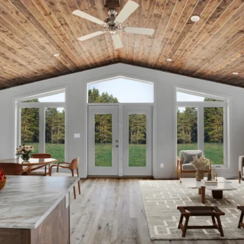 ‘Charcoal Grey’ shingles, ‘Bright White’ soffit/fascia, ‘Snow White’ vinyl siding with ‘Iron Ore’ trim, Whitewash pine ceilings, BeautiTone ‘Mochacchino’ walls, Armstrong ‘Buttermilk’ flooring, MDF ‘Pure White’ custom cabinets, Wilsonart ‘Arctic Snow’ laminate countertops.