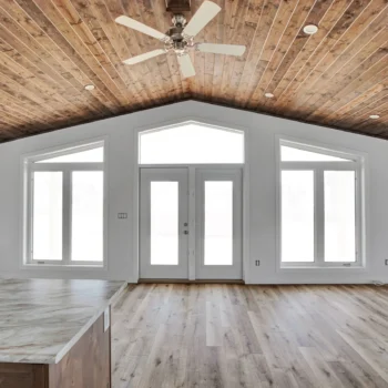 ‘Charcoal Grey’ shingles, ‘Bright White’ soffit/fascia, ‘Storm’ vinyl siding with ‘Iron Ore’ trim, Whitewash pine ceilings, BeautiTone ‘Mochacchino’ walls, Armstrong ‘Silver Reflections’ flooring, Alder ‘Milestone’ custom cabinets, Wilsonart ‘Italian White Di Pesco’ laminate countertops.