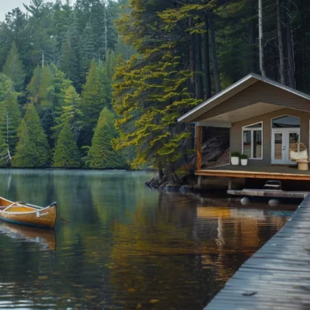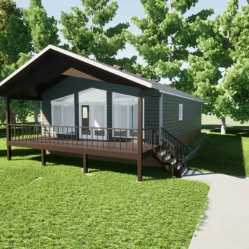‘Charcoal Grey’ shingles, ‘Bright White’ soffit/fascia, ‘Pebble’ vinyl siding with ‘Iron Ore’ trim, Whitewash pine ceilings, BeautiTone ‘Mochacchino’ walls, Armstrong ‘Falling Leaves’ flooring, Alder ‘Jaco Sprout’ custom cabinets, Wilsonart ‘Arenite’ laminate countertops.
