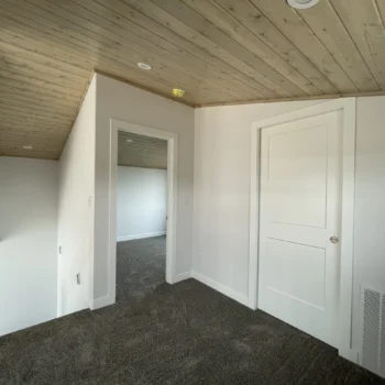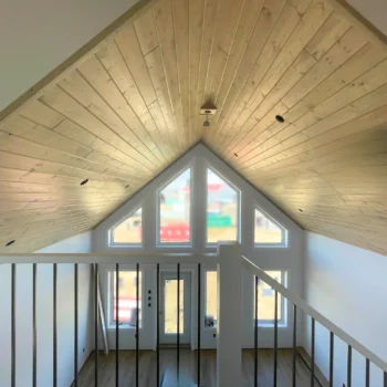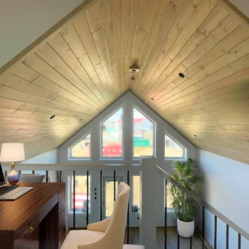 - Zak’s signature expansive vaulted pine ceiling