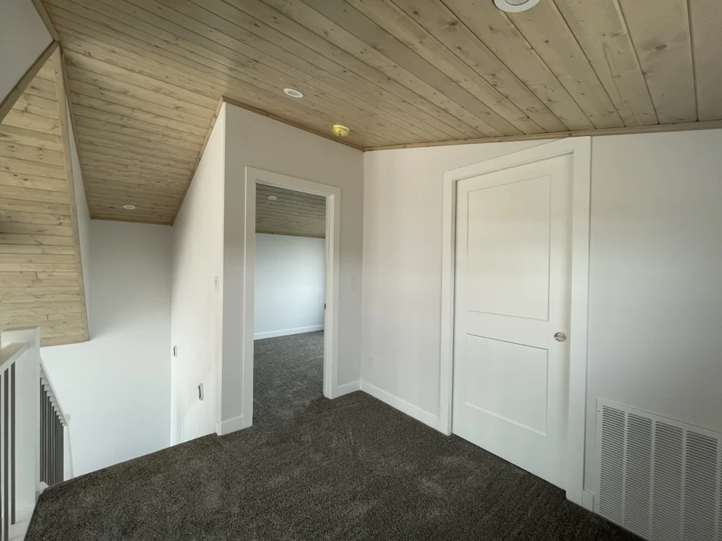 ‘Charcoal Grey’ shingles, ‘Bright White’ soffit/fascia, ‘Storm’ vinyl siding with ‘Iron Ore’ trim, Whitewash pine ceilings, BeautiTone ‘Mochacchino’ walls, Armstrong ‘Silver Reflections’ flooring, Alder ‘Milestone’ custom cabinets, Wilsonart ‘Italian White Di Pesco’ laminate countertops.