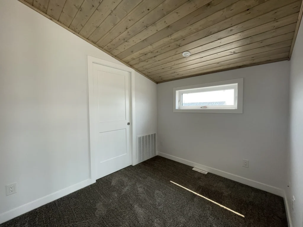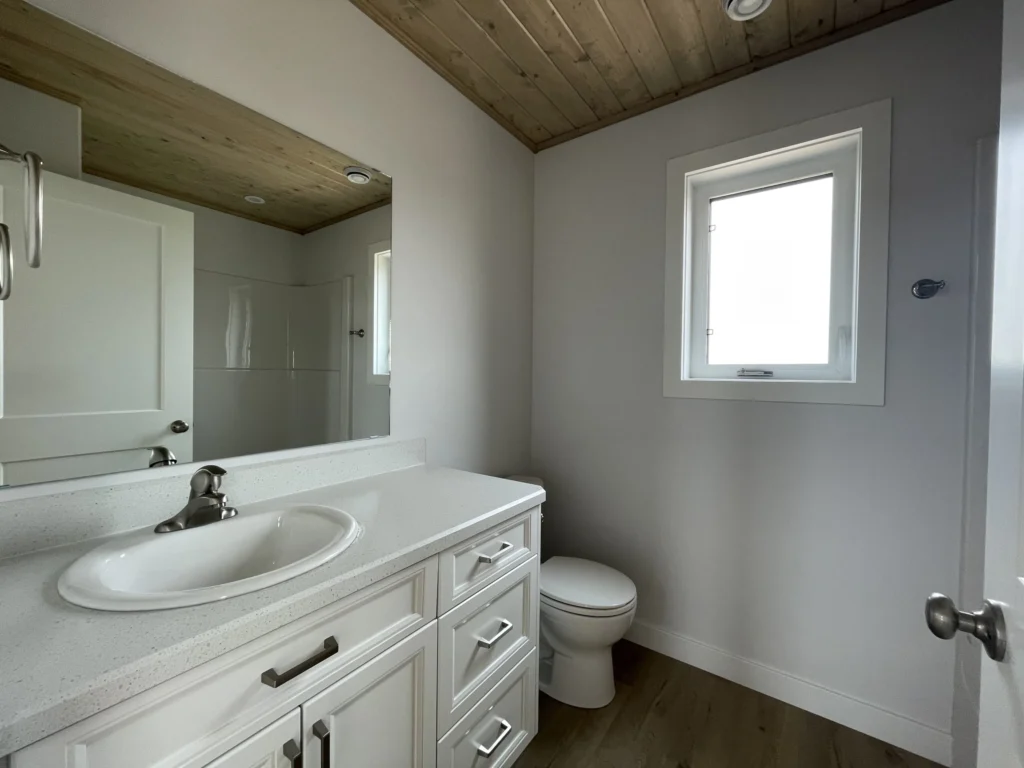 ‘Charcoal Grey’ shingles, ‘Bright White’ soffit/fascia, ‘Pebble’ vinyl siding with ‘Iron Ore’ trim, Whitewash pine ceilings, BeautiTone ‘Mochacchino’ walls, Armstrong ‘Falling Leaves’ flooring, Alder ‘Jaco Sprout’ custom cabinets, Wilsonart ‘Drama Marble’ laminate countertops.