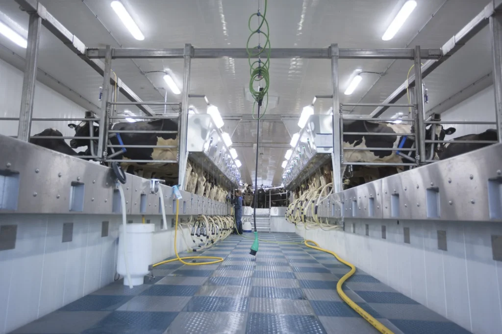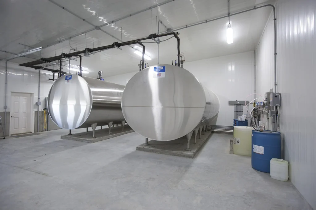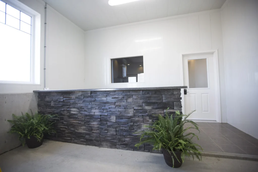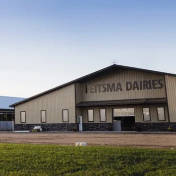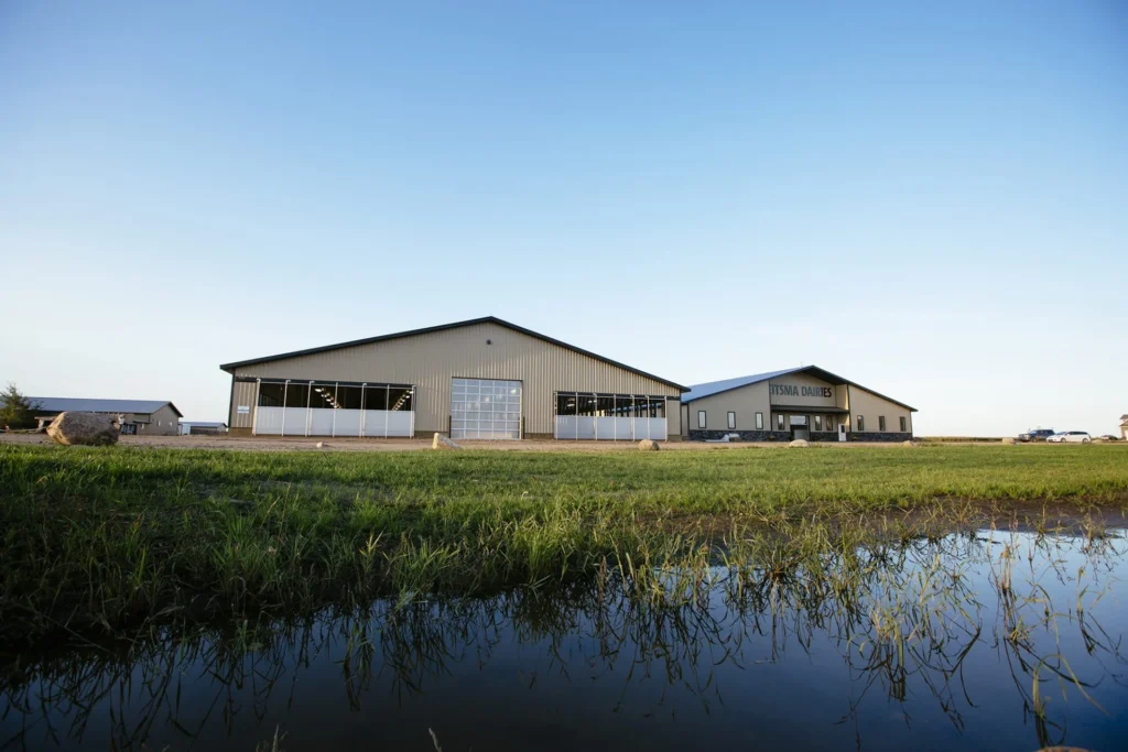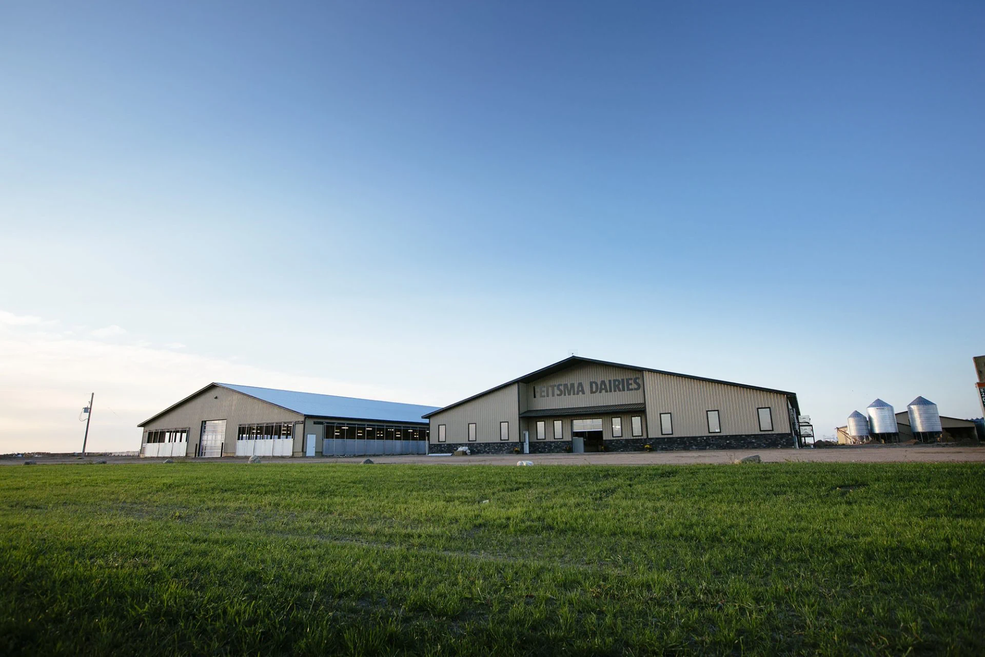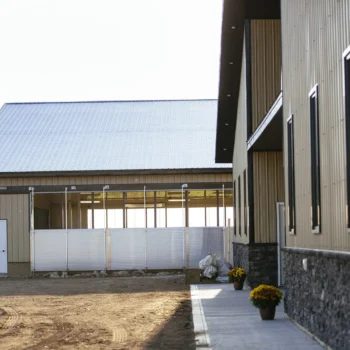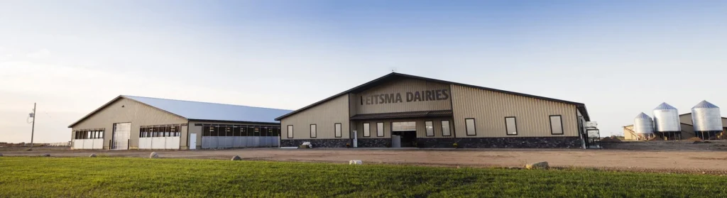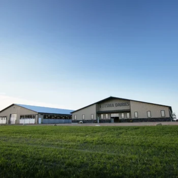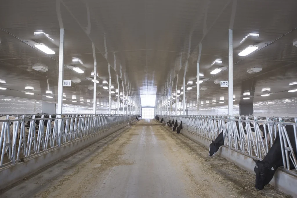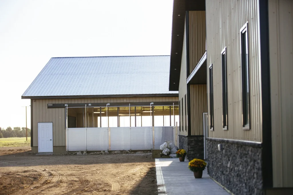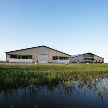 This state-of-the-art facility is a large-scale dairy operation in Saskatchewan. When you are a large scale producer, you need your farm to run seamlessly and incorporate designs you can count on. Standard features like engineered roof trusses, concrete foundations and durable construction materials give you peace of mind. White polymer interior panels brighten up the interior of the barn and are easy to clean. Additional touches that separate this facility from standard ones include a design centered around a high-end milking parlor, an attractively finished front entrance with stone reception desk, and a staff kitchen and eating area.