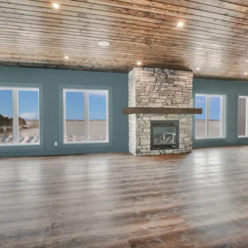 Stone to ceiling fireplace with custom Zak’s rustic mantle