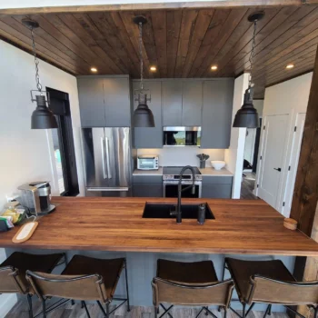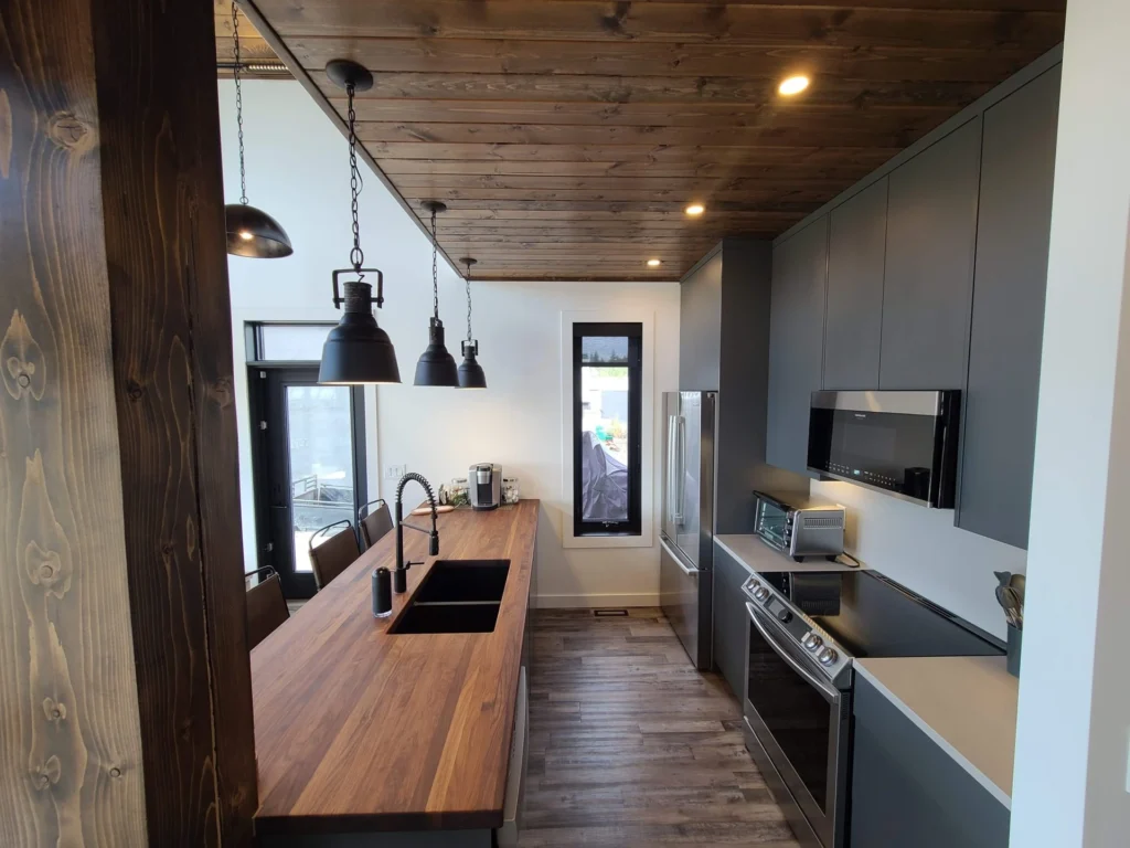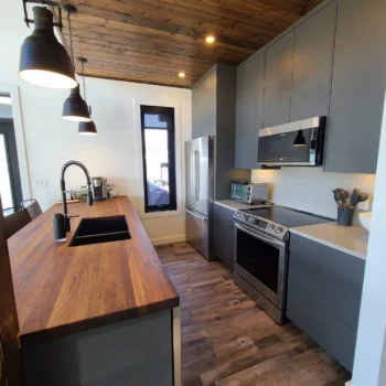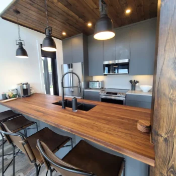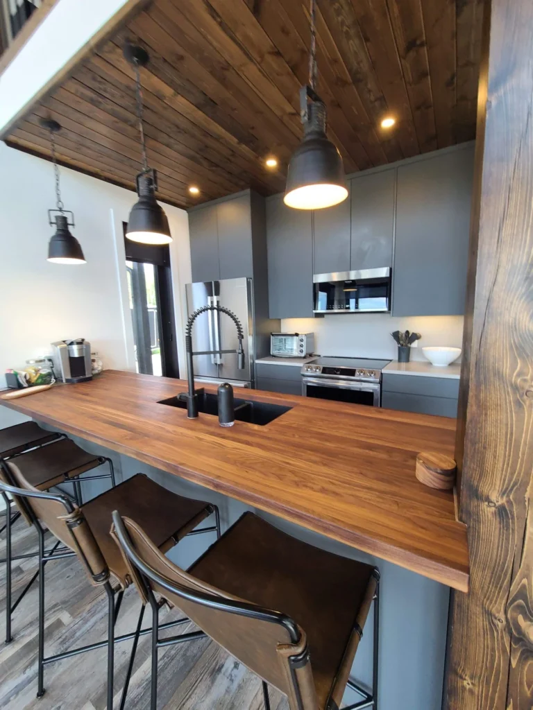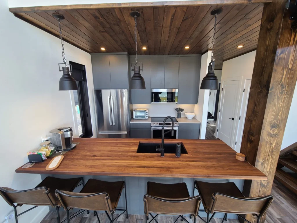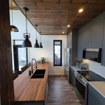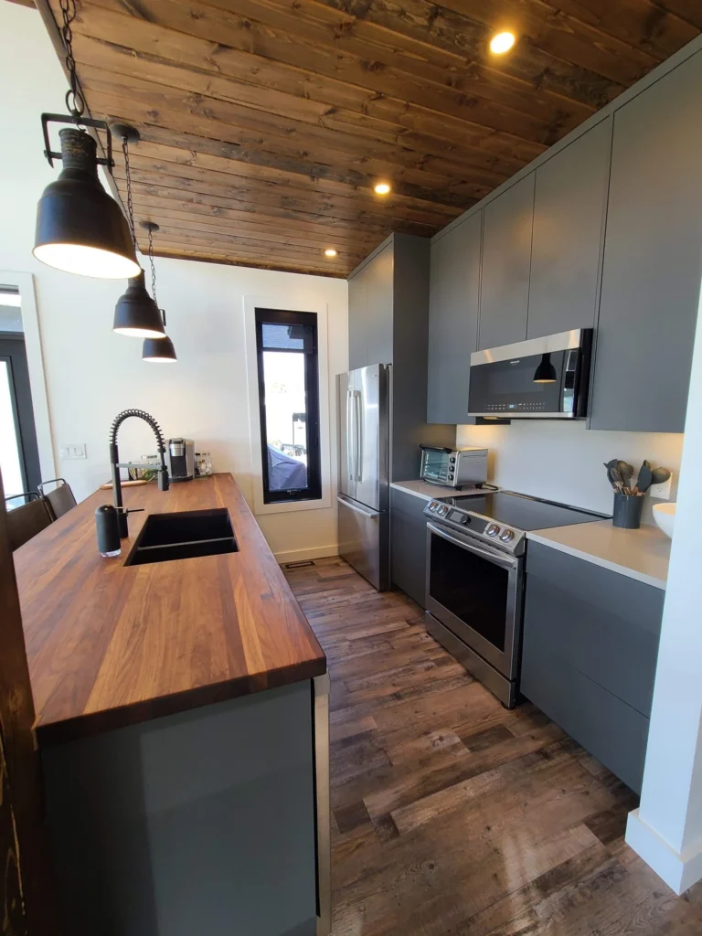 The Godson project challenged us to maximize the space we had available, therefore encouraging us to go with a galley kitchen. A perk to this layout is having accessible storage within arms reach at all times. The wood and slate hues give a masculine touch to the space as it opens up into living room and dining area, providing that balance of warm and cool that is needed.
