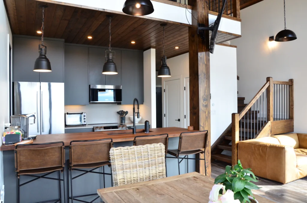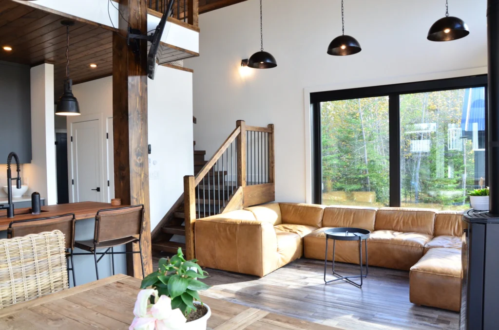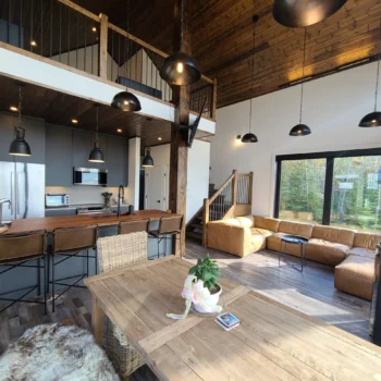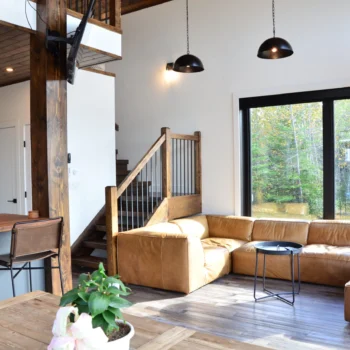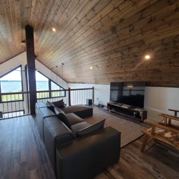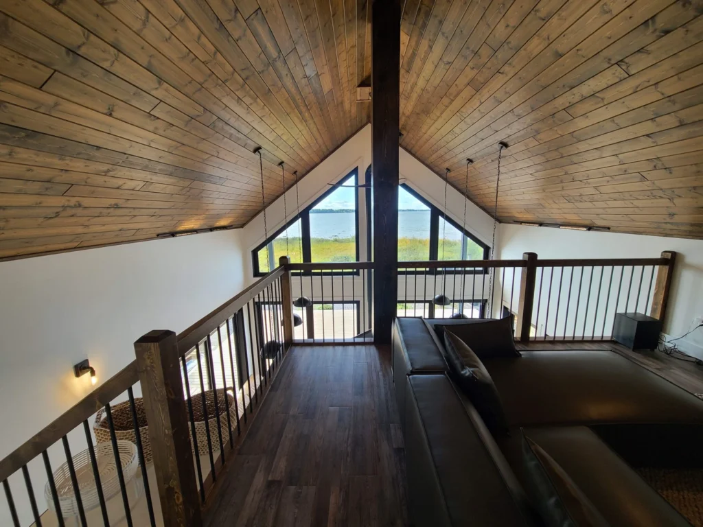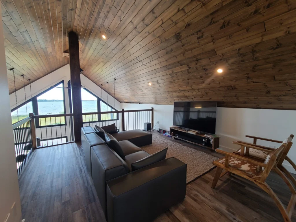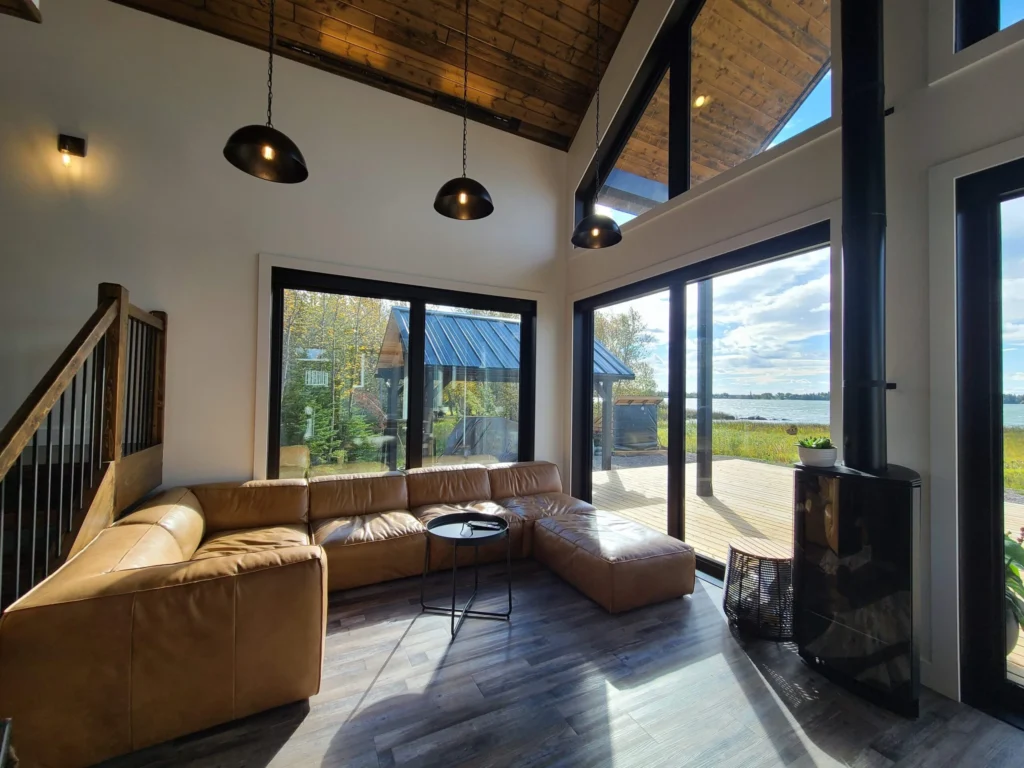 Lake views were the priority in this project, and we can see why! With a full wall of windows off the back deck you have full view of your property from the main floor to the loft. The high end finishes in this cottage deliver a modern aesthetic while keeping it casual, which is one of the most beautiful blends.