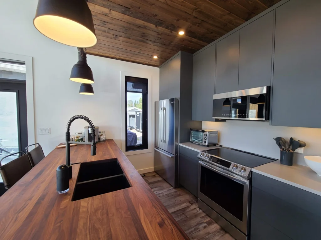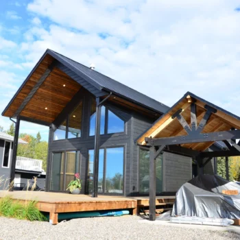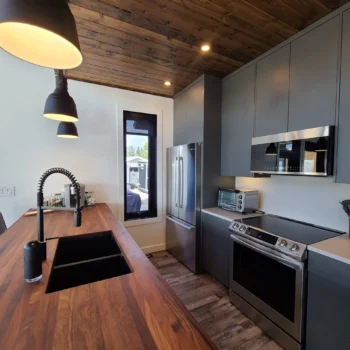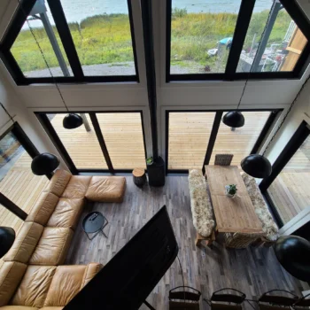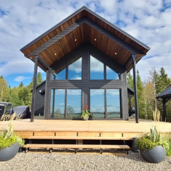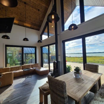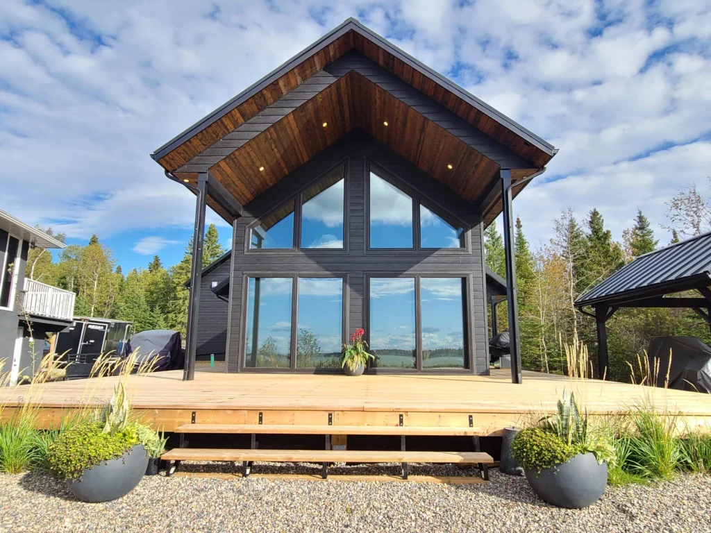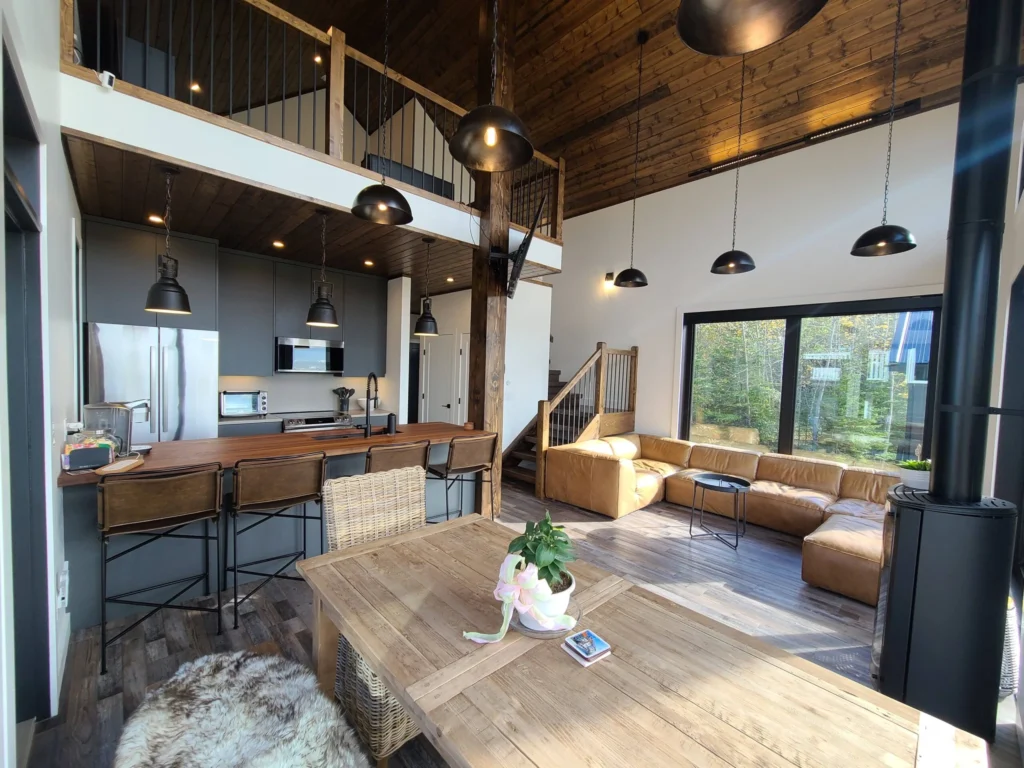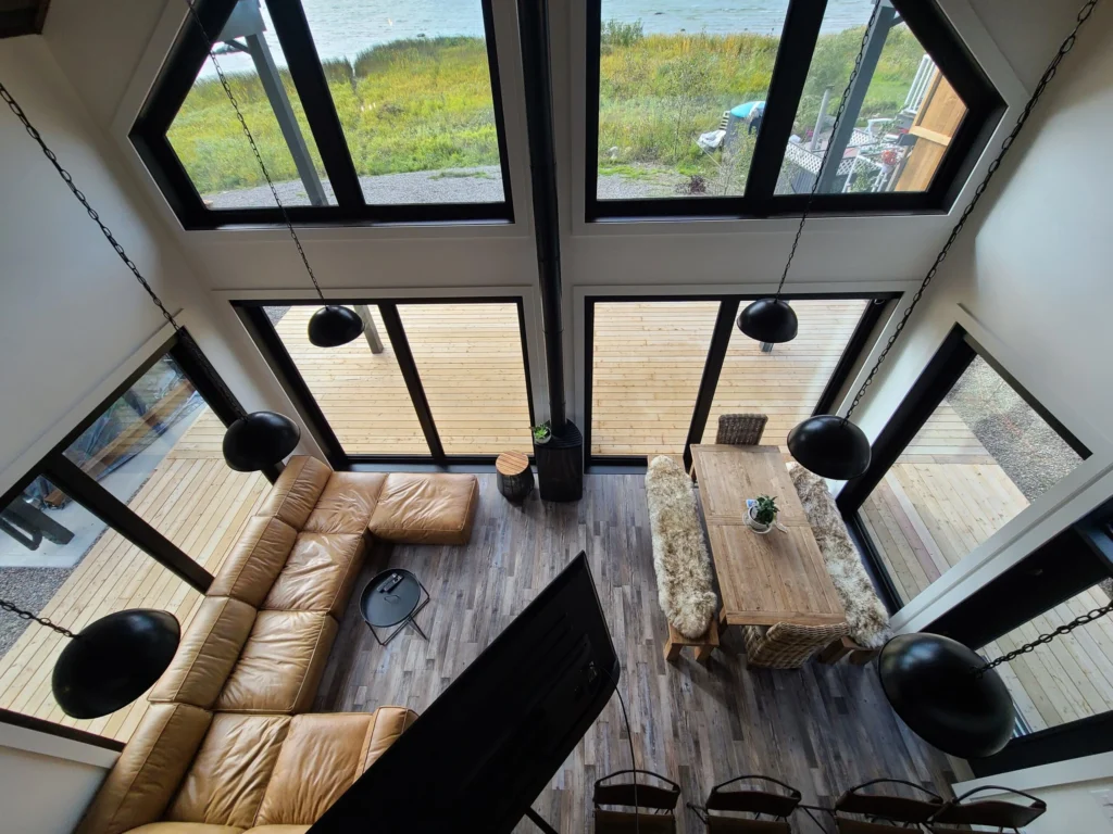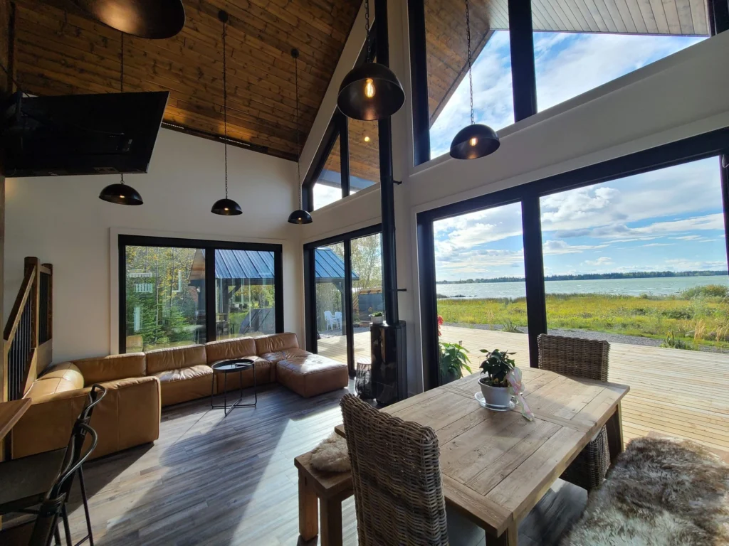 Lake views were the priority in this project, and we can see why! With a full wall of windows off the back deck you have full view of your property from the main floor to the loft. The high end finishes in this cottage deliver a modern aesthetic while keeping it casual, which is one of the most beautiful blends.