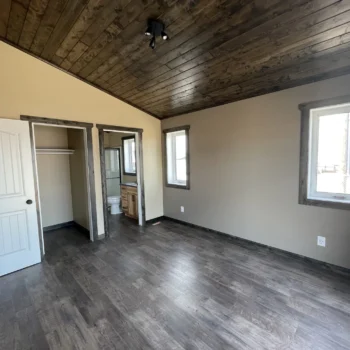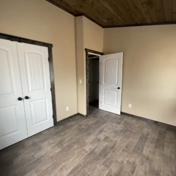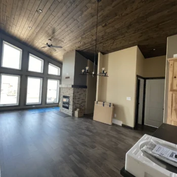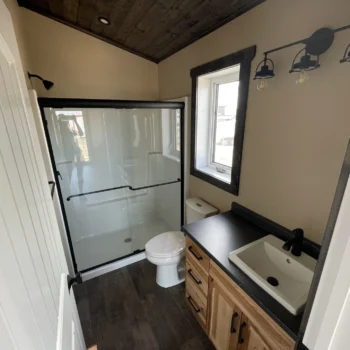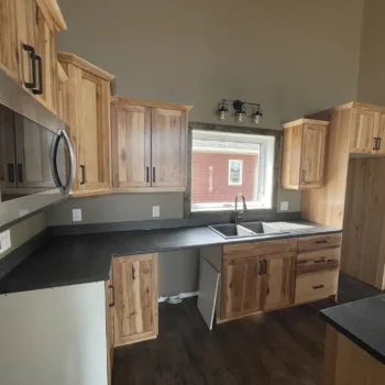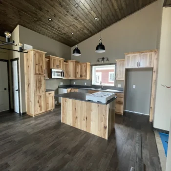 Don’t judge a book by it’s cover; this custom shows modern but reads cabin comfort. Features like the Natural Rustic Hickory cabinets and the woodburning fireplace bring warmth into this cozy cabin.
