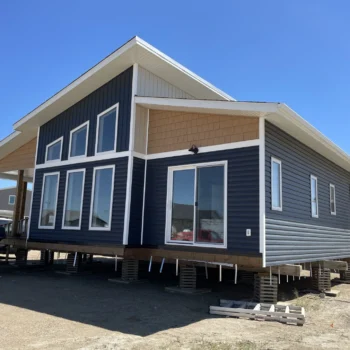 • Exteriors of Biltmore Driftwood shingles, with Gentek vinyl siding in Marine Dusk and Monterray Sand. Gentek Grayne Shakes in Tuscan Gold complete the exteriors.