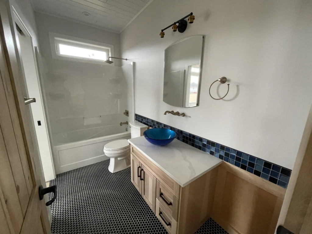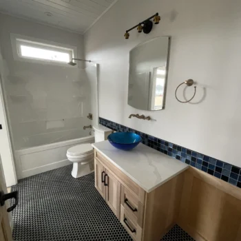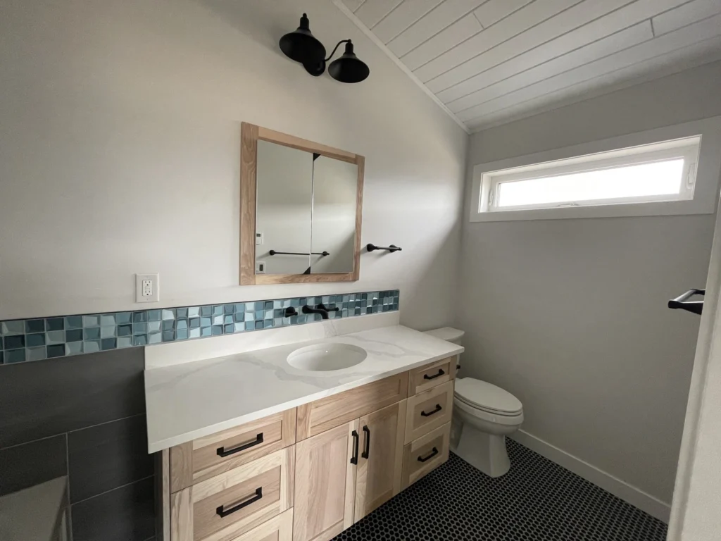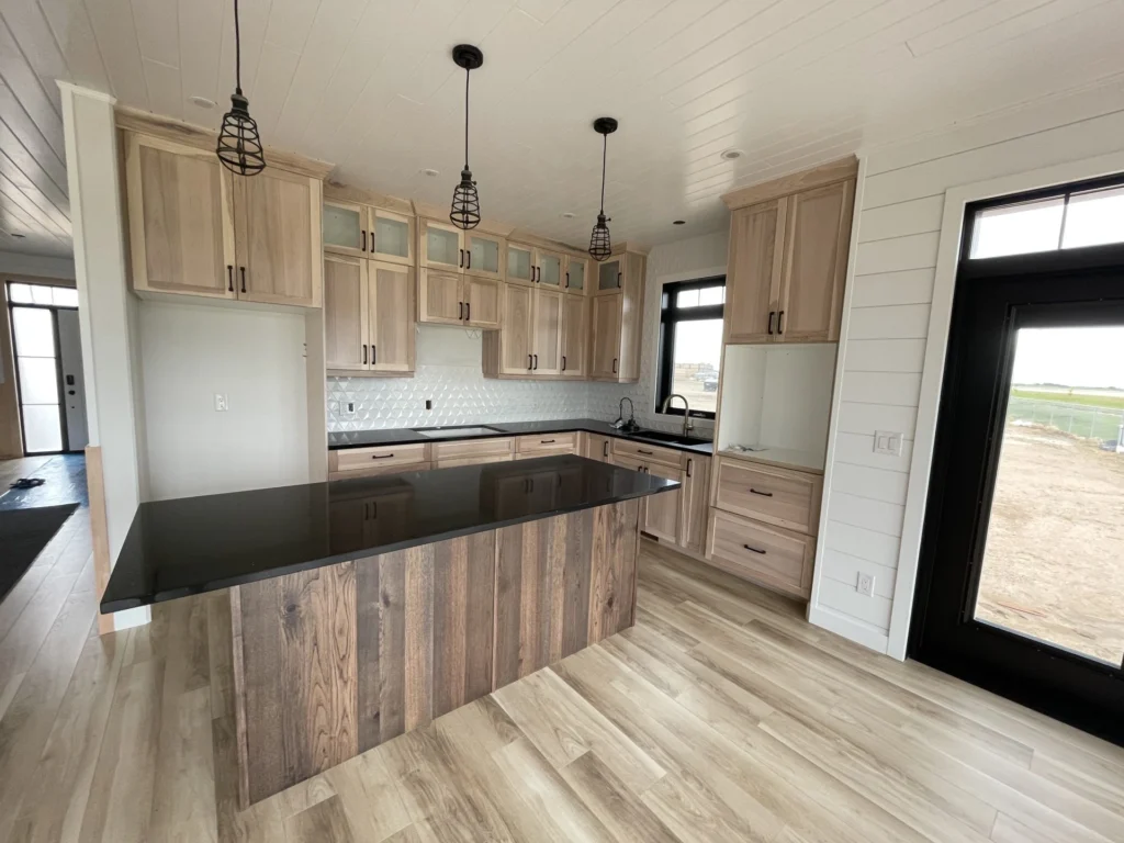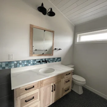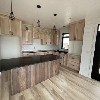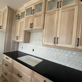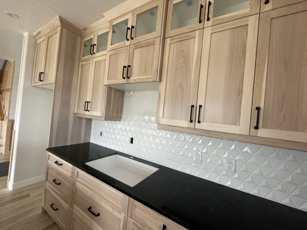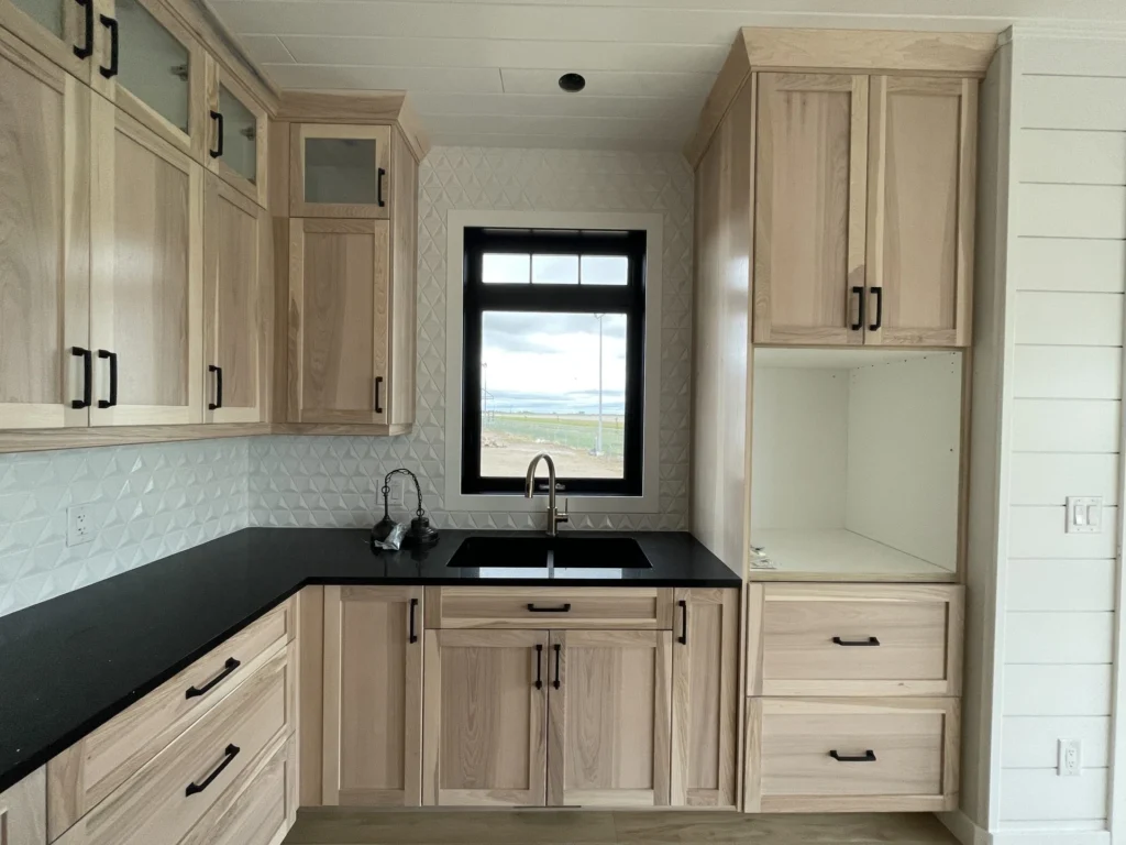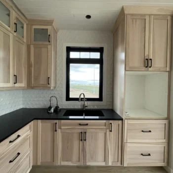 In this project, we had the opportunity to work closely with the customer to create a design that reflected their personal style. The bold, black quartz countertops pop against the light rustic hickory cabinetry, and the addition of matte black hardware creates a strong tie in with the other fixtures. A perfect mix of textures, the dark and light accents complement the tile backsplash and create a beautifully unique home to be enjoyed for years to come.