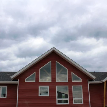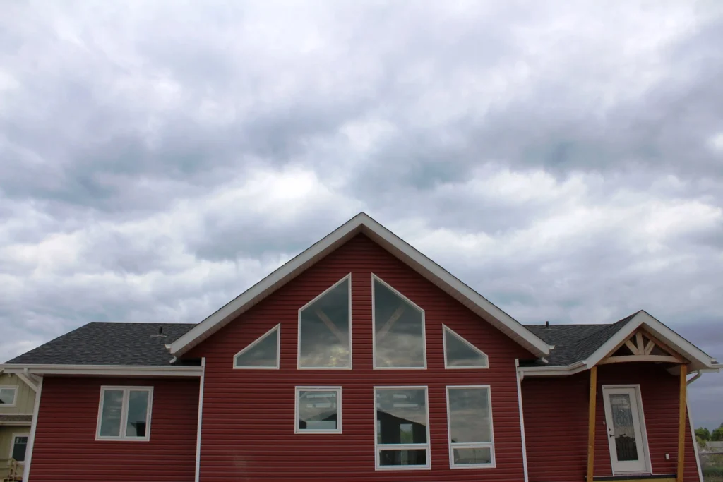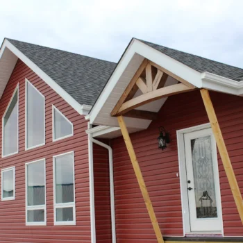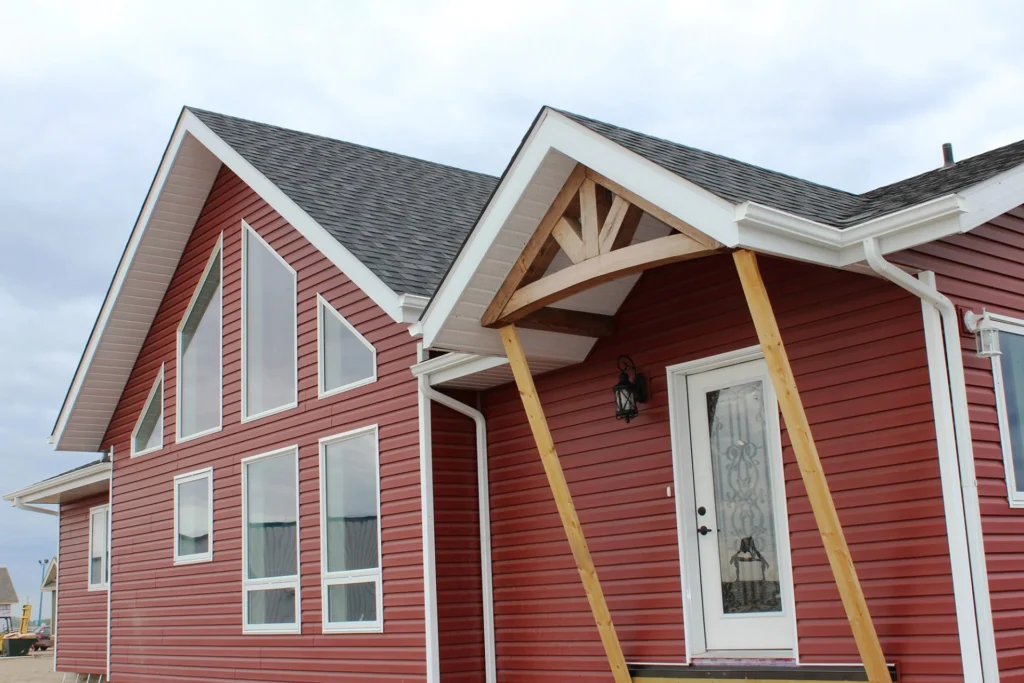 Exteriors of Biltmore Dual Black shingles, with Mitten Richmond Red vinyl siding