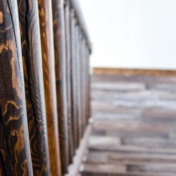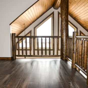 From all-natural pine ceilings and energy-efficient windows to custom cabinets and elegant fixtures and faucets, this wood-infused home offers generous helpings of both nature and luxury. Log post and ridge beam railings on the stairs pair with those on the loft mezzanine.