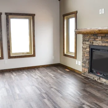 • Interiors of BeautiTone paint in “Wend Swept”, “Big Spender” and “Umber Style”, with a flooring blend of Shamrock Newport 1 Westeros Wood LVP and Dream Weaver Metro Mocha carpet