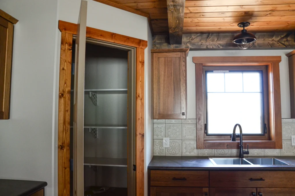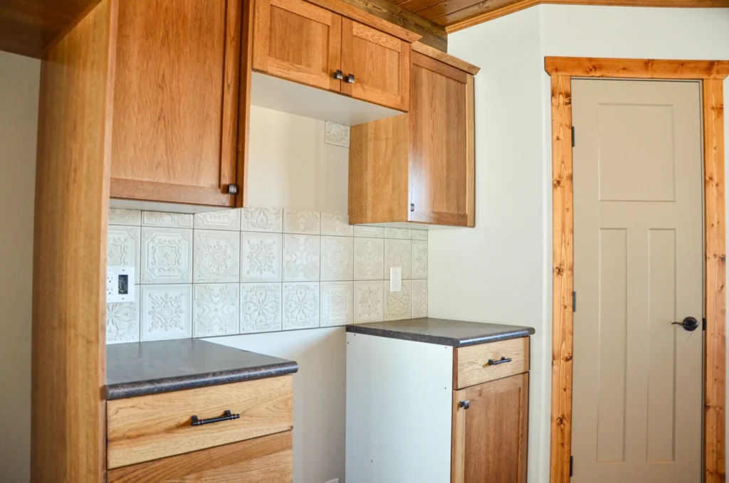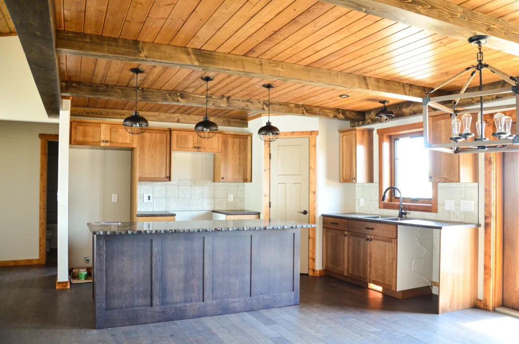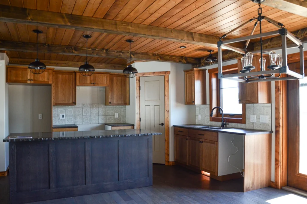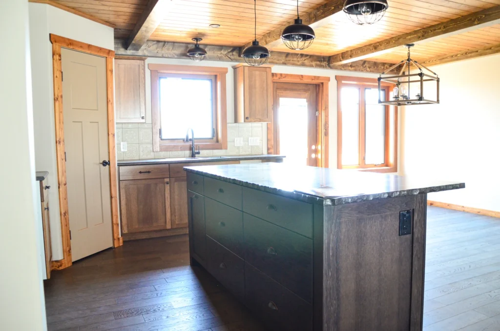 This rustic-style cottage is perfect for a lakeside retreat! Includes wooden custom cabinets and a unique quartz countertop by Zak’s Custom Cabinets.