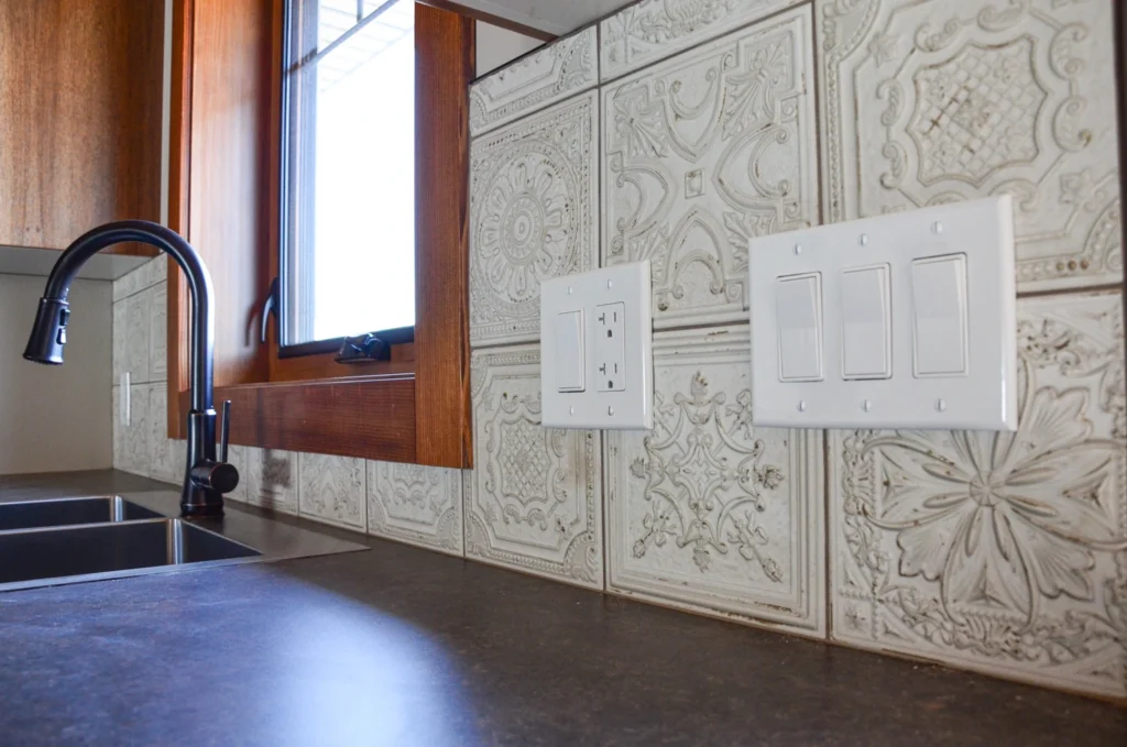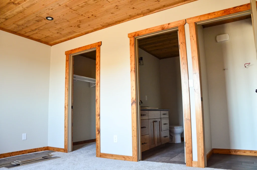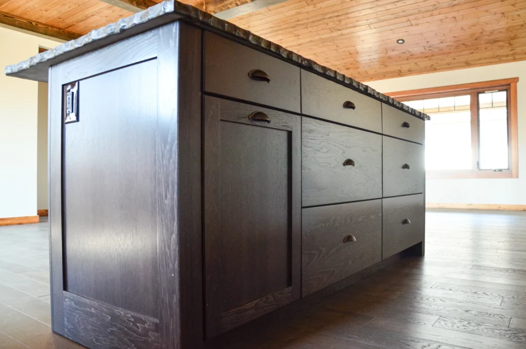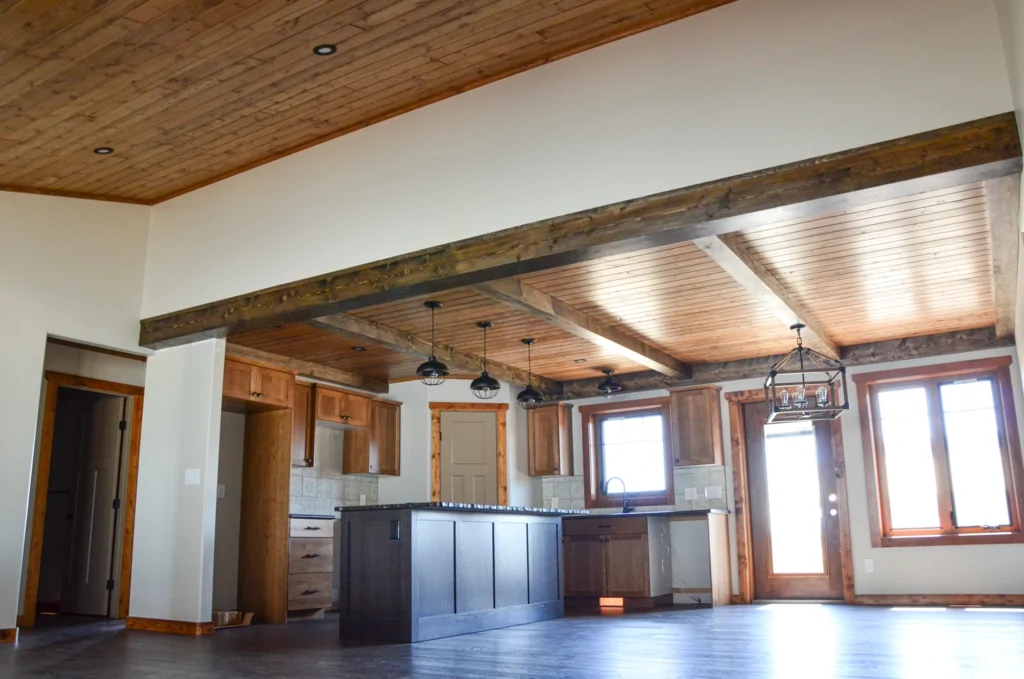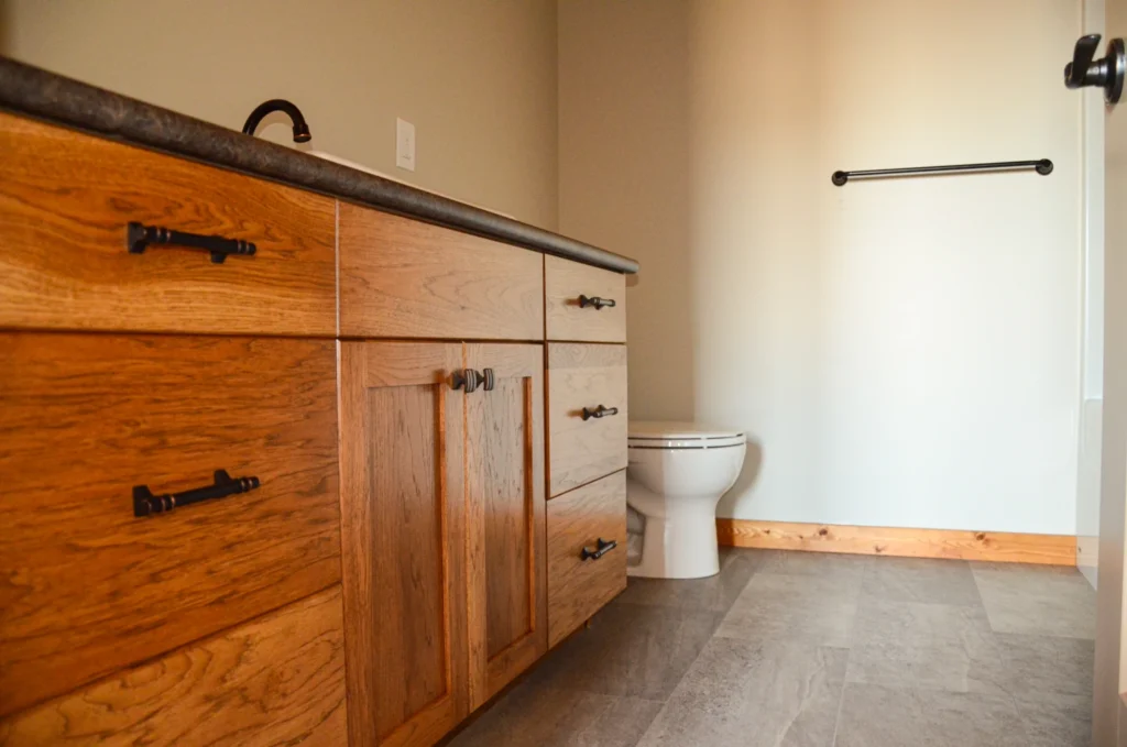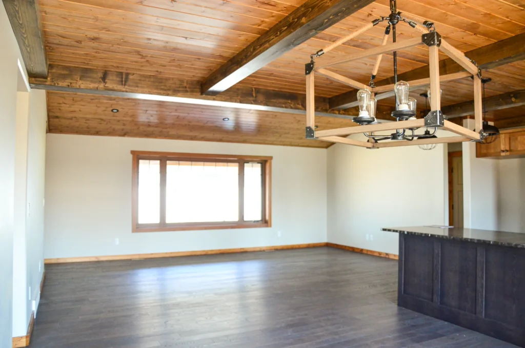 This rustic-style cottage is perfect for a lakeside retreat! Includes wooden custom cabinets and a unique quartz countertop by Zak’s Custom Cabinets.