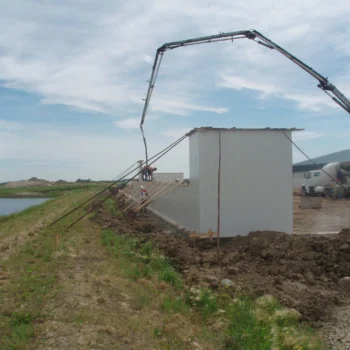 This dairy farm operation is built to last, incorporating specialized features such as polymer-encased concrete walls, formed and poured on site, that provide exceptional structural integrity as well as easy maintenance and cleaning. Three-part engineered trusses are vaulted inside, which provides excellent airflow and gives the interior space a large, open feeling.