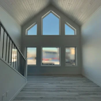 ‘Charcoal Grey’ shingles, ‘Bright White’ soffit/fascia, ‘Storm’ vinyl siding with ‘Iron Ore’ trim, Whitewash pine ceilings, BeautiTone ‘Mochacchino’ walls, Armstrong ‘Silver Reflections’ flooring, Alder ‘Milestone’ custom cabinets, Wilsonart ‘Italian White Di Pesco’ laminate countertops.