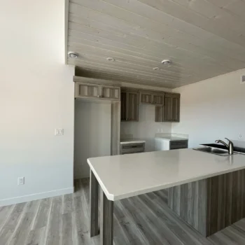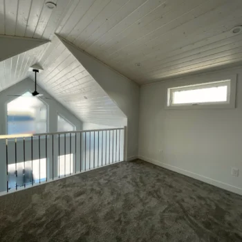 ‘Charcoal Grey’ shingles, ‘Bright White’ soffit/fascia, ‘Pebble’ vinyl siding with ‘Iron Ore’ trim, Whitewash pine ceilings, BeautiTone ‘Mochacchino’ walls, Armstrong ‘Falling Leaves’ flooring, Alder ‘Jaco Sprout’ custom cabinets, Wilsonart ‘Drama Marble’ laminate countertops.