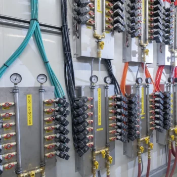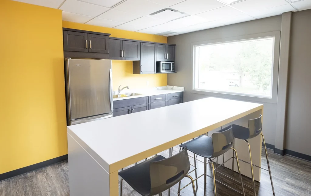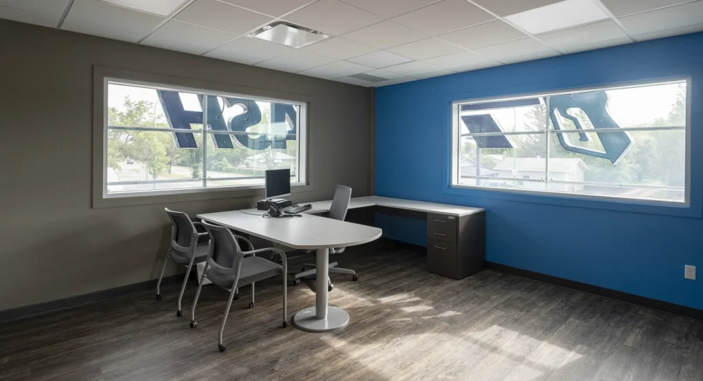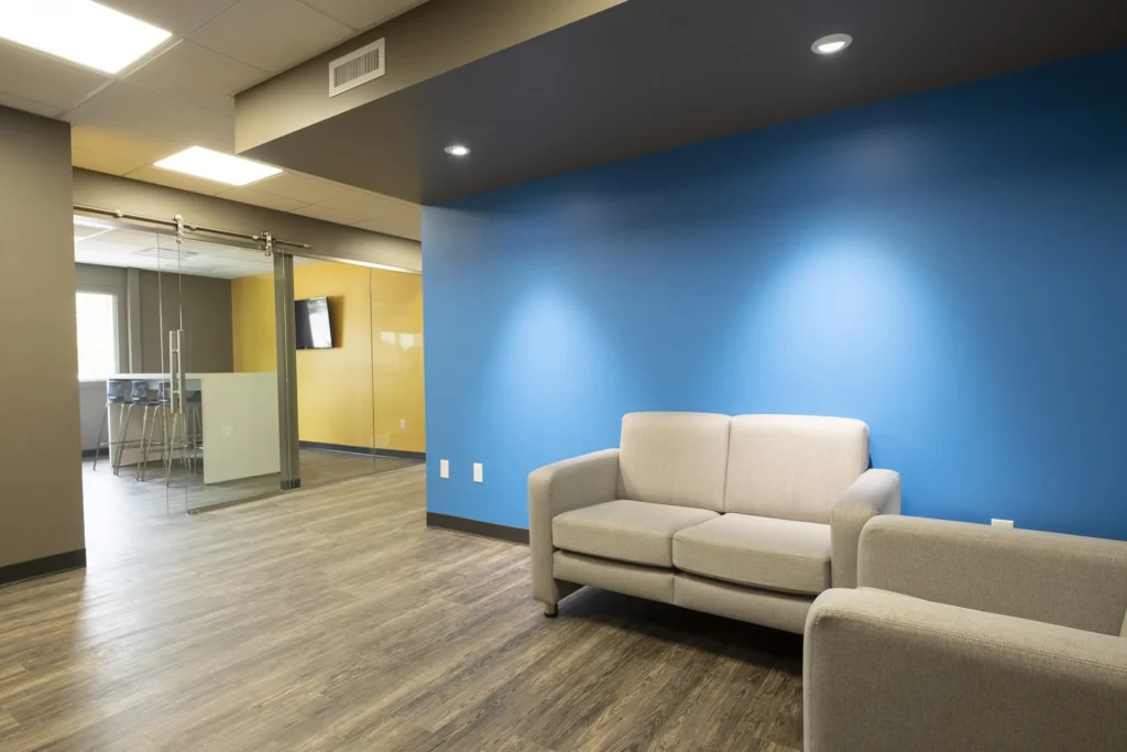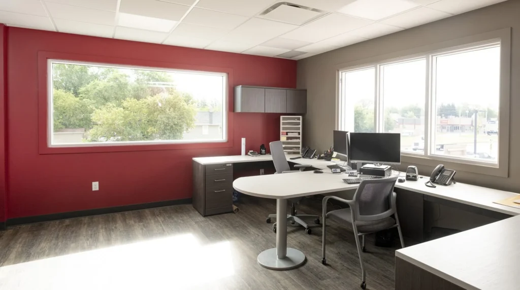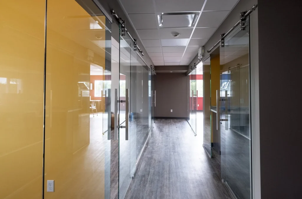 Inside the office are bright colors, impressive interior glazing and sliding doors with aluminum hardware. Nothing was spared in the construction of this state-of-the-art facility. It’s a functional and attractive structure that will last for many years.