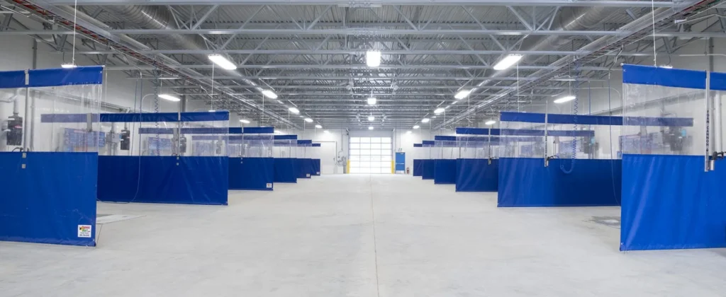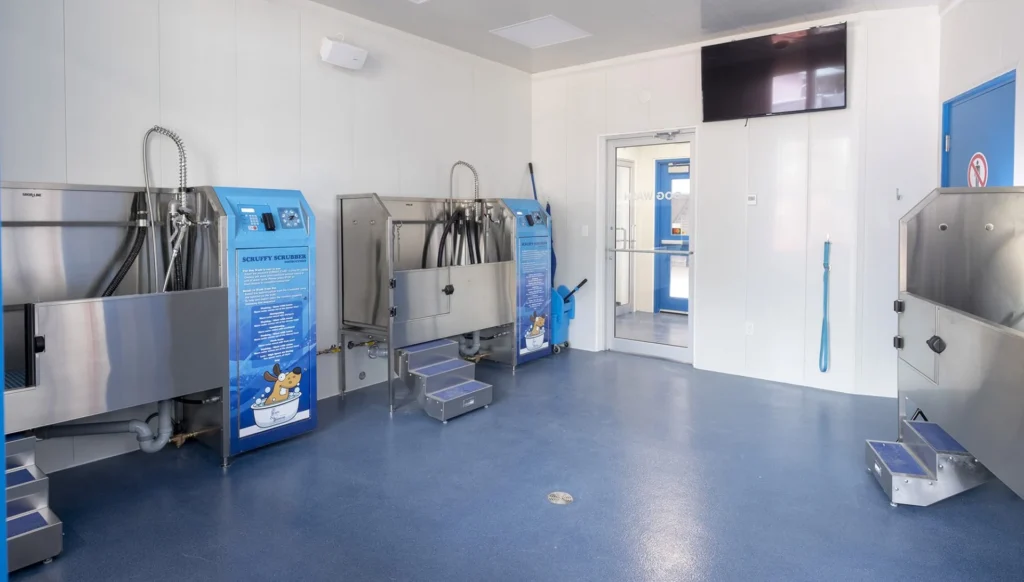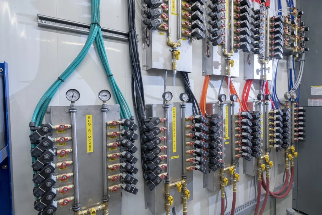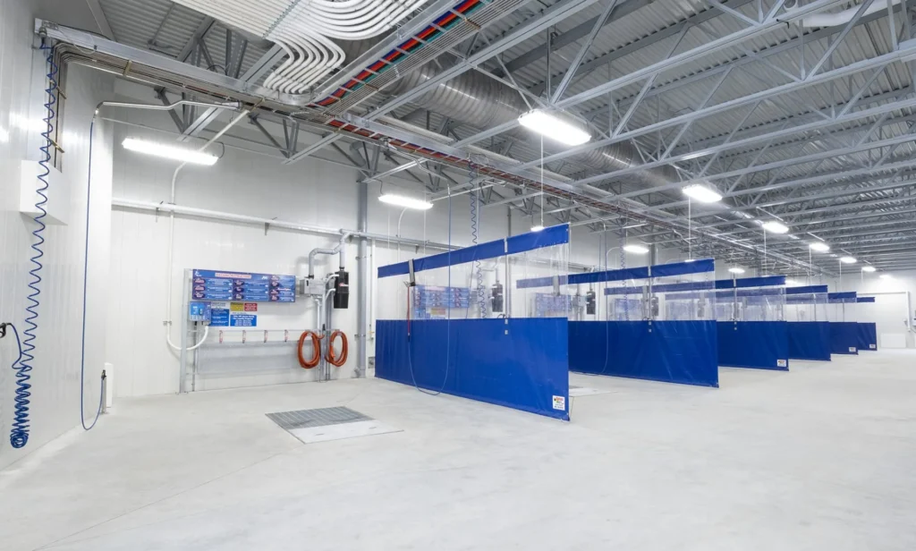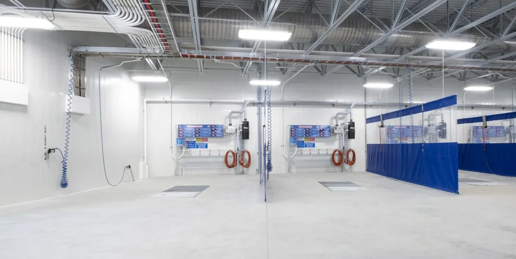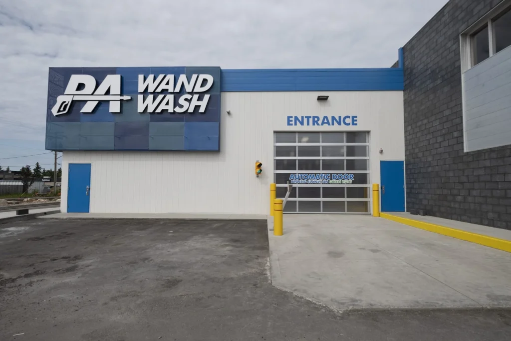 The carwash construction made use of durable, concrete-filled polymer panels that have exceptional structural strength and are easy to maintain. A flat-roofed EPDM membrane system with open-web steel joists (OWSJ) allows for a large, clear-span interior with lots of room to manoeuvre cars.