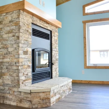 • Wood burning fireplace with custom mantle, and Timberstone Timberwolf Craft Split Modular stone hearth