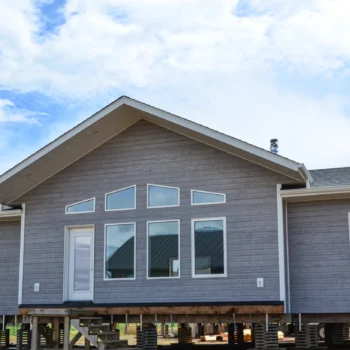 • Exteriors of Biltmore Charcoal Grey shingles, with CanExel Ridgewood-Barnwood siding