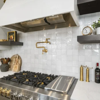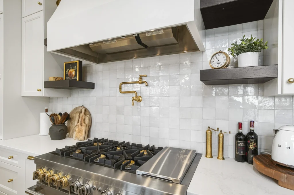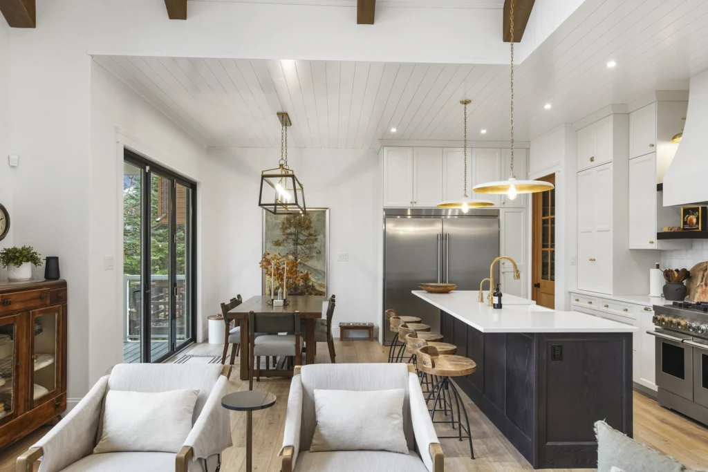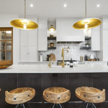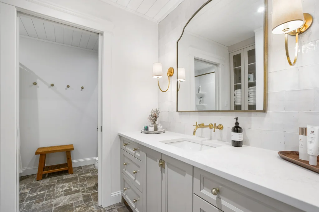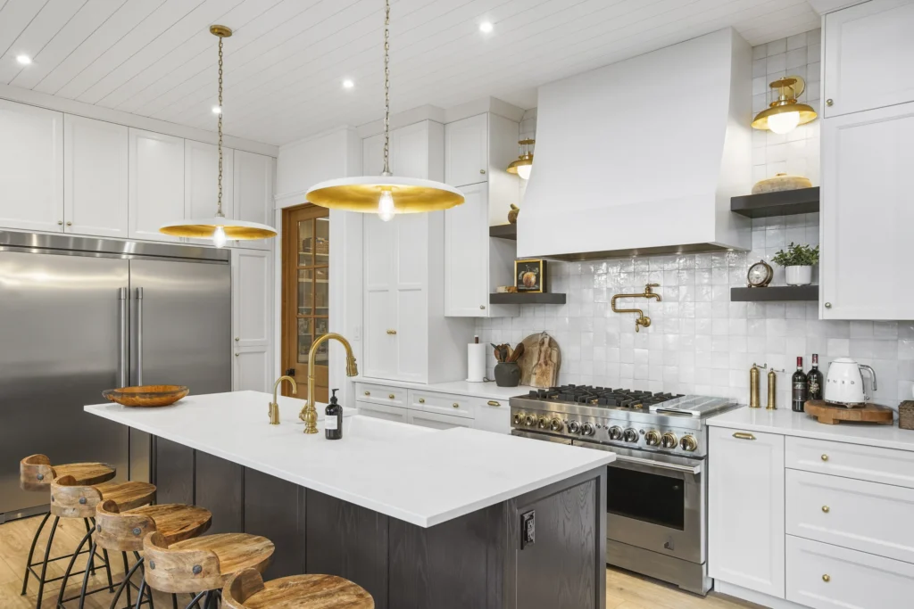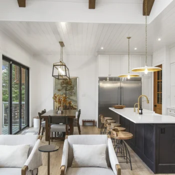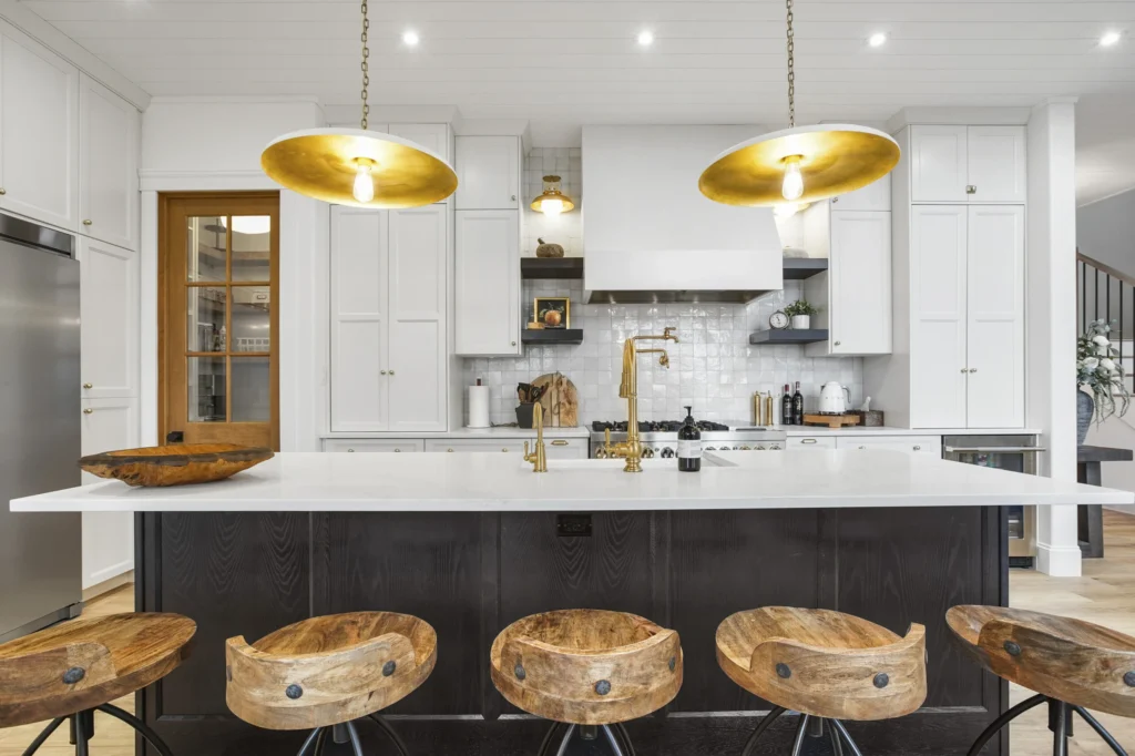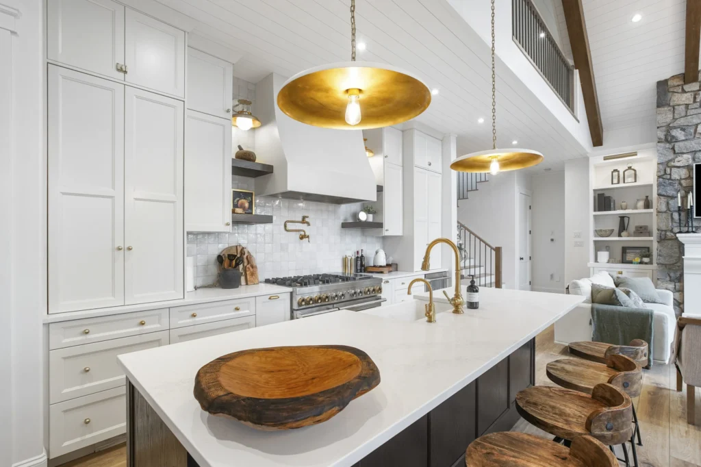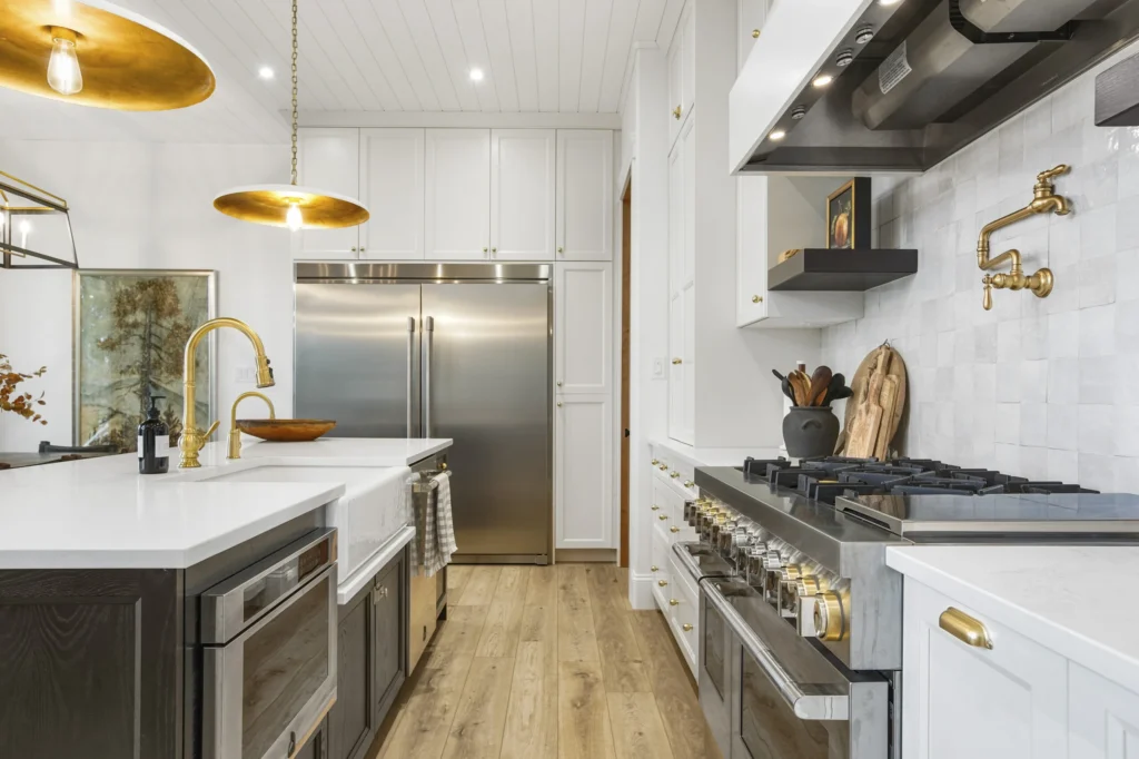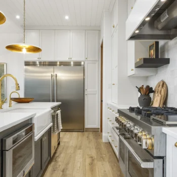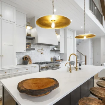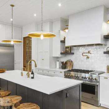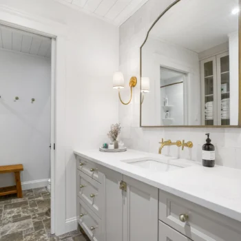 Right out of a magazine, the Phipps-Orvold cabinets are a dream! Continuing the cabinetry to the ceiling – which is 10 feet – maximizes the space, and mixing the depth of the uppers gives this linear space great dimension. We blended woods with painted Maple on the perimeter, a handsomely stained Red Oak island, and stained Maple in the ensuite vanity. Our favorite moments in this kitchen are the custom range hood, the butlers pantry, and the farmhouse sink… we couldn’t pick just one.