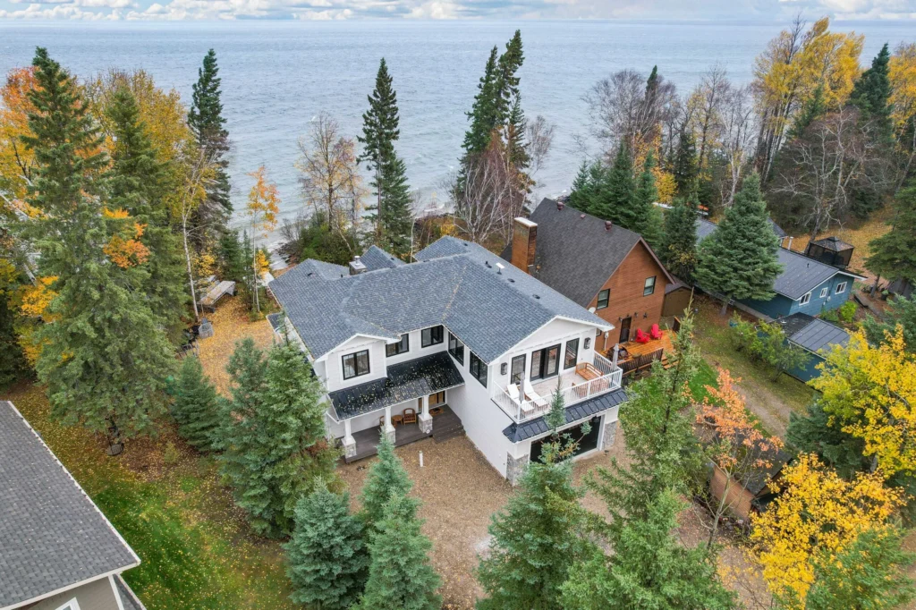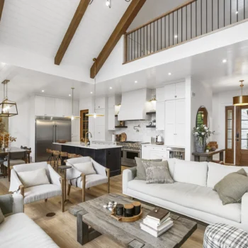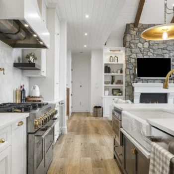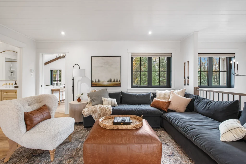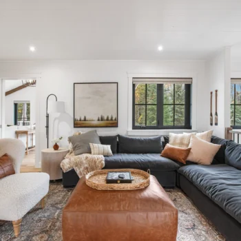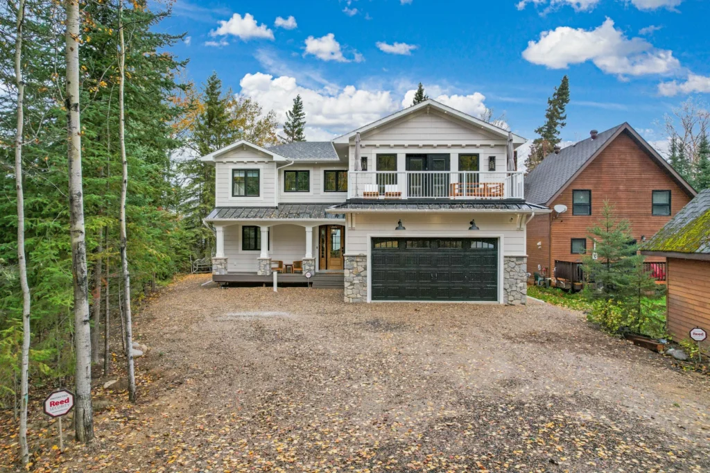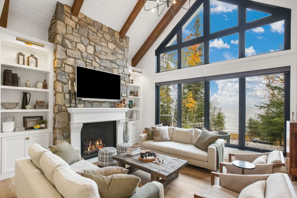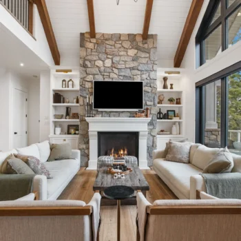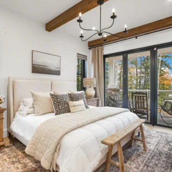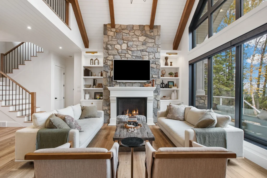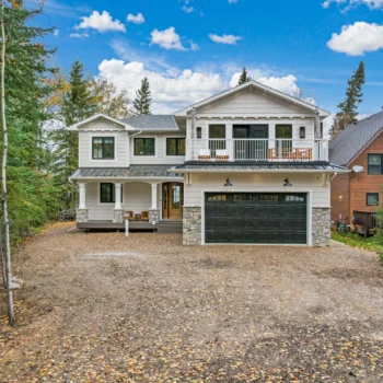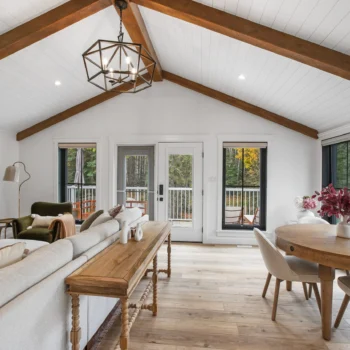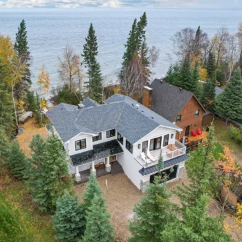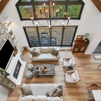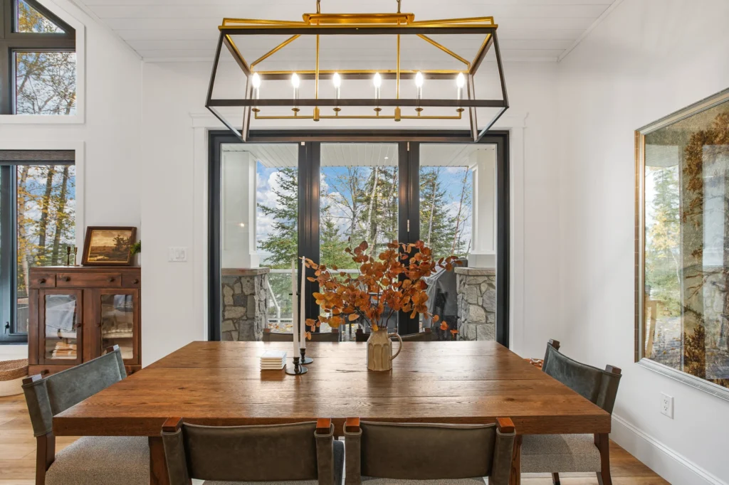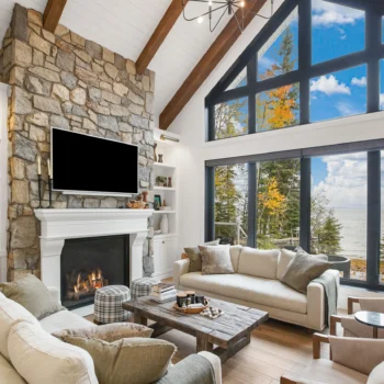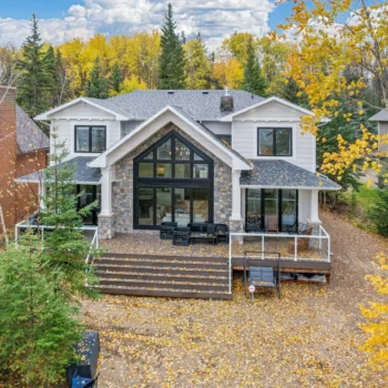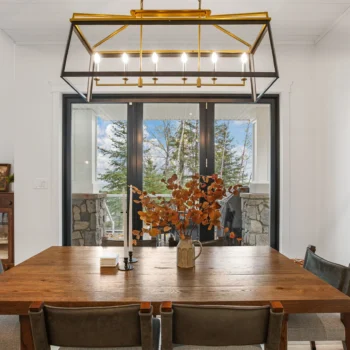 Phipps-Orvold, true cabin luxury. This site build is lakefront, with a 2687sqft footprint boasting 4 bedrooms and 3 bathrooms. We made the most of the view with ample windows throughout, including bi fold patio doors off the primary suite and dining. The kitchen features a 48″ multi-finish range, complimented by gold accents throughout. A full stone hearth in the living room draws your eyes up, where they meet the beams displaying our signature nickel gap vaults. In the loft we’ve maximized our space with a separate lounge area, a full bonus room and deck above the attached garage, and 3 bedrooms.