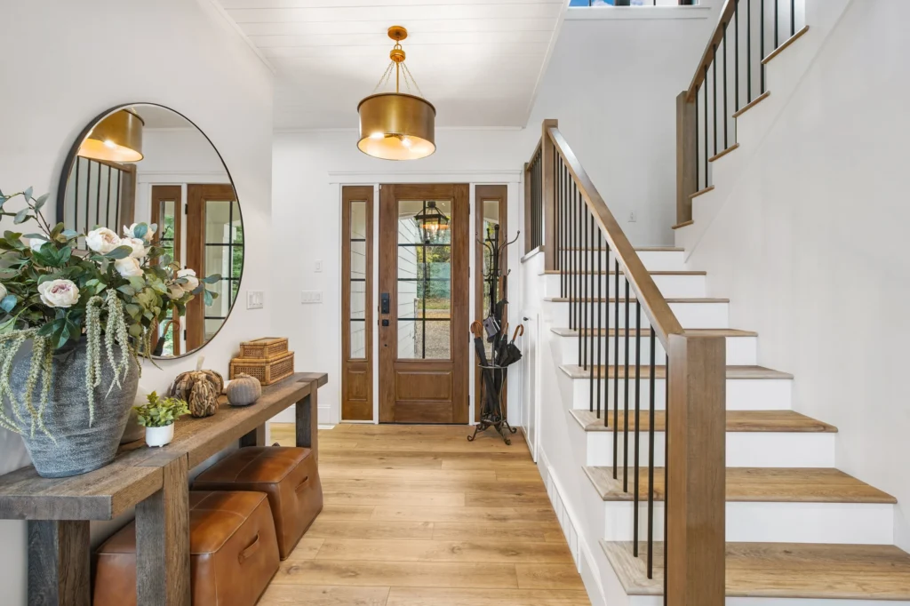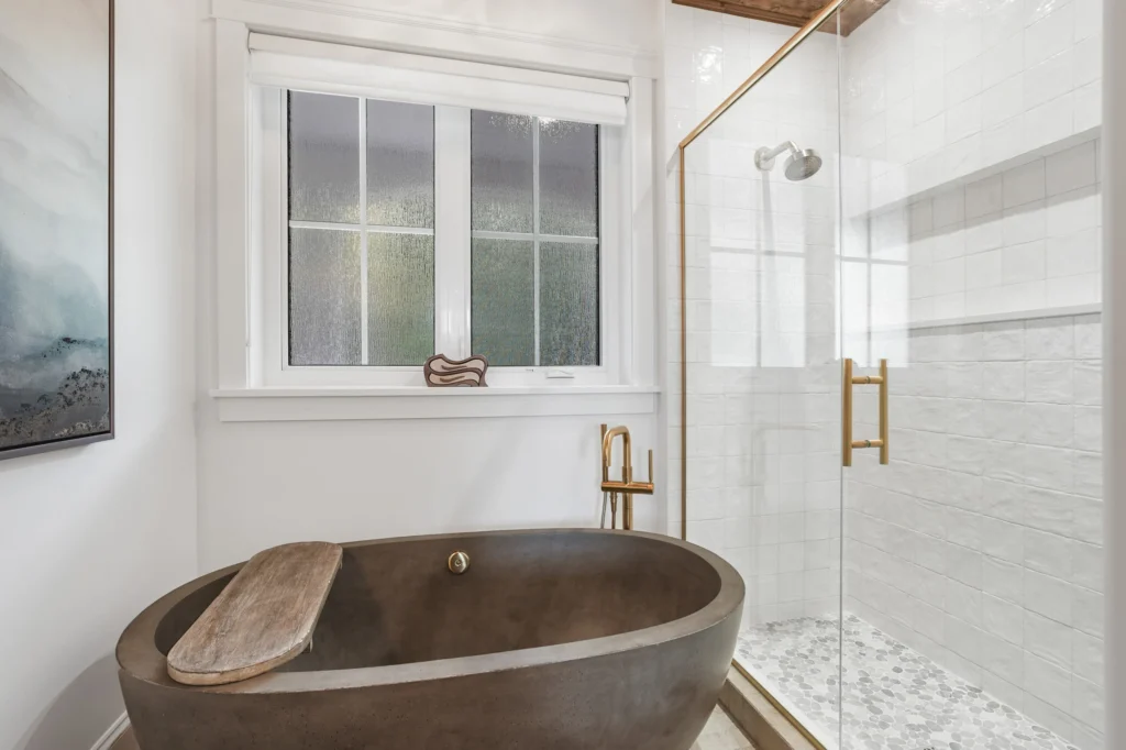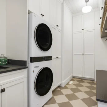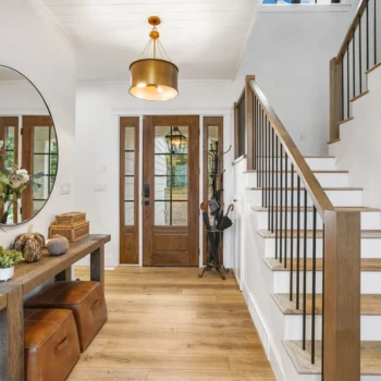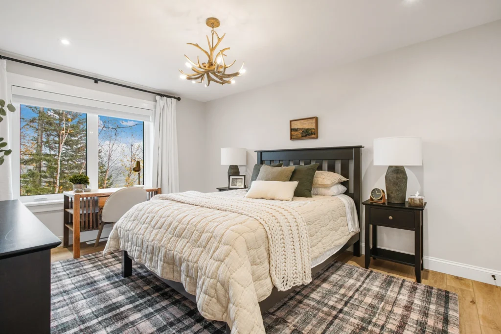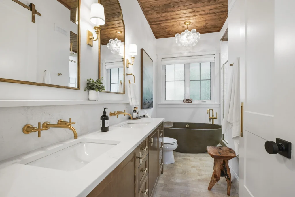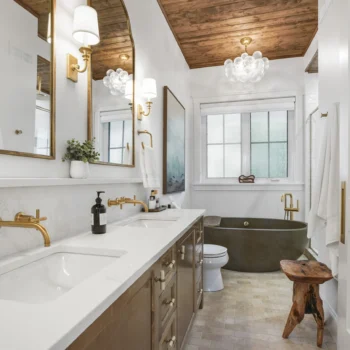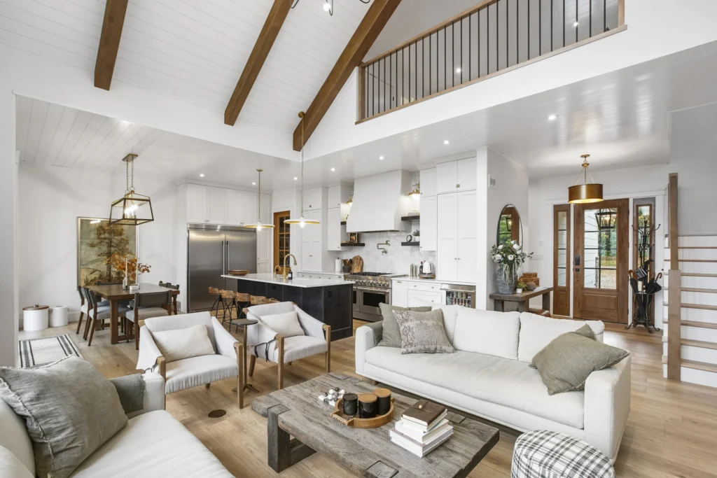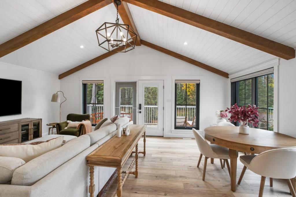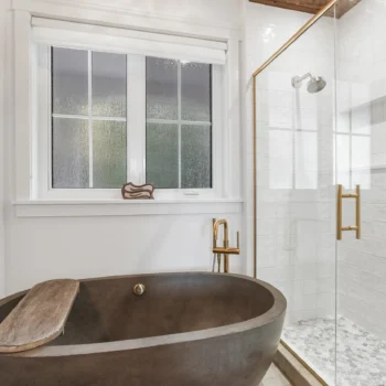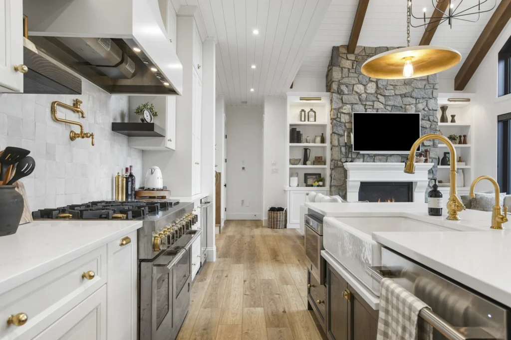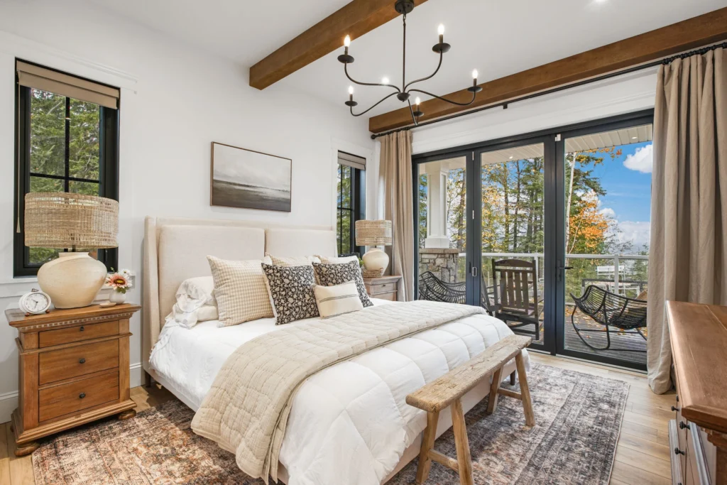 Phipps-Orvold, true cabin luxury. This site build is lakefront, with a 2687sqft footprint boasting 4 bedrooms and 3 bathrooms. We made the most of the view with ample windows throughout, including bi fold patio doors off the primary suite and dining. The kitchen features a 48″ multi-finish range, complimented by gold accents throughout. A full stone hearth in the living room draws your eyes up, where they meet the beams displaying our signature nickel gap vaults. In the loft we’ve maximized our space with a separate lounge area, a full bonus room and deck above the attached garage, and 3 bedrooms.