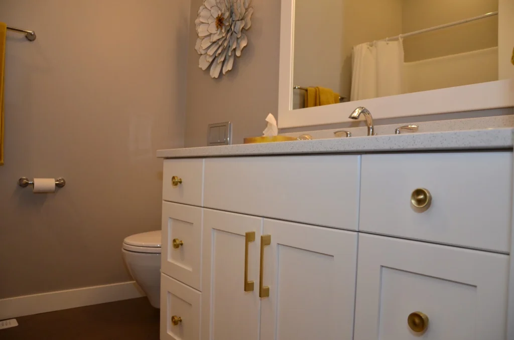 Quartz countertops by Caesarstone, in Vanilla Noir and White Attica. Vanities in Hanstone Specchio White