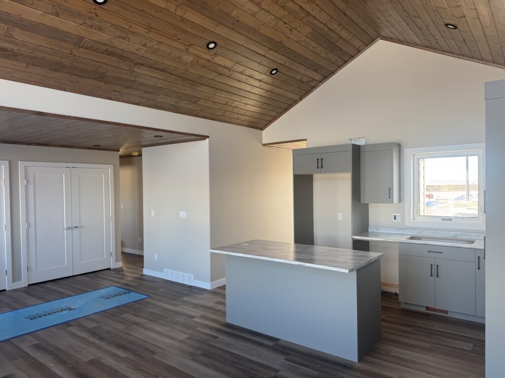 Zak’s signature vaulted pine ceiling in kitchen and living room
