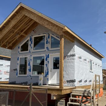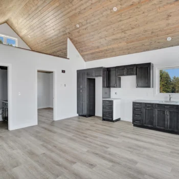 ‘Charcoal Grey’ shingles, ‘Bright White’ soffit/fascia, ‘Pebble’ vinyl siding with ‘Iron Ore’ trim, Whitewash pine ceilings, BeautiTone ‘Mochacchino’ walls, Armstrong ‘Falling Leaves’ flooring, Alder ‘Jaco Sprout’ custom cabinets, Wilsonart ‘Drama Marble’ laminate countertops.