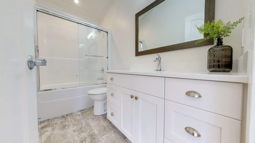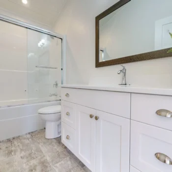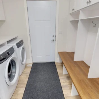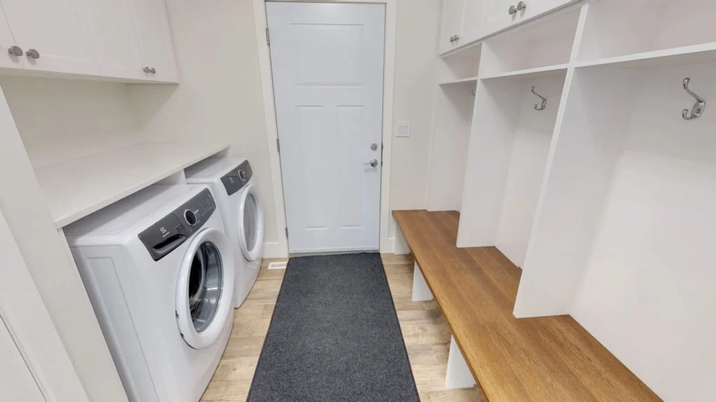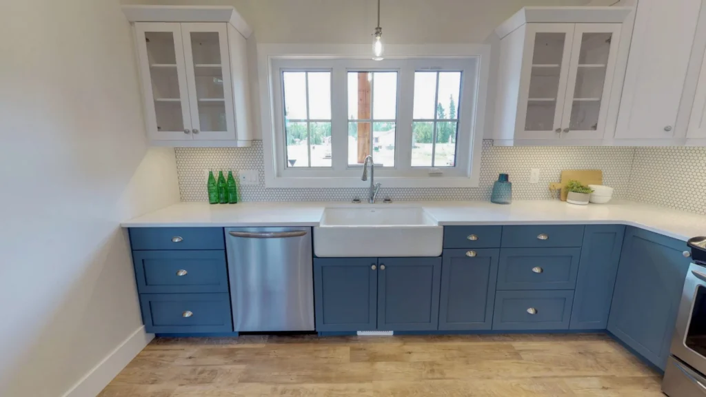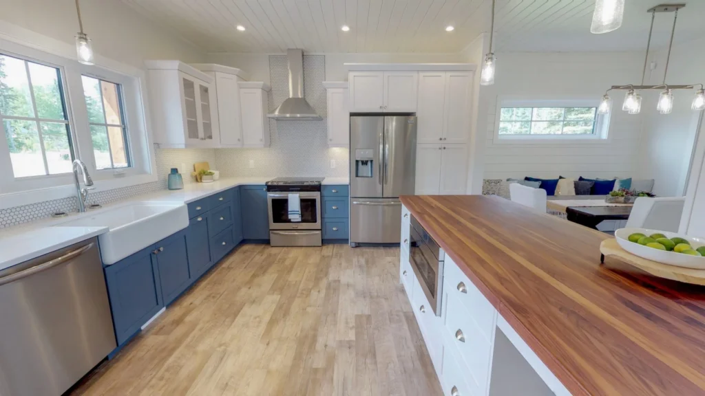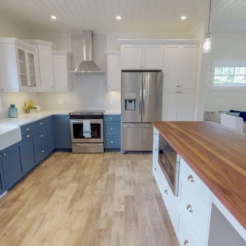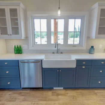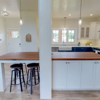 Living in community is what drove the design of the 2018 Lottery Home. This layout was specifically chosen to bring others in, with seating at the island and in the dining area. The two-toned cabinetry keeps the room feeling light and bright while grounding the space with a fun pop of color.