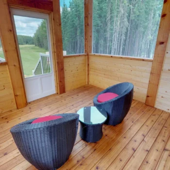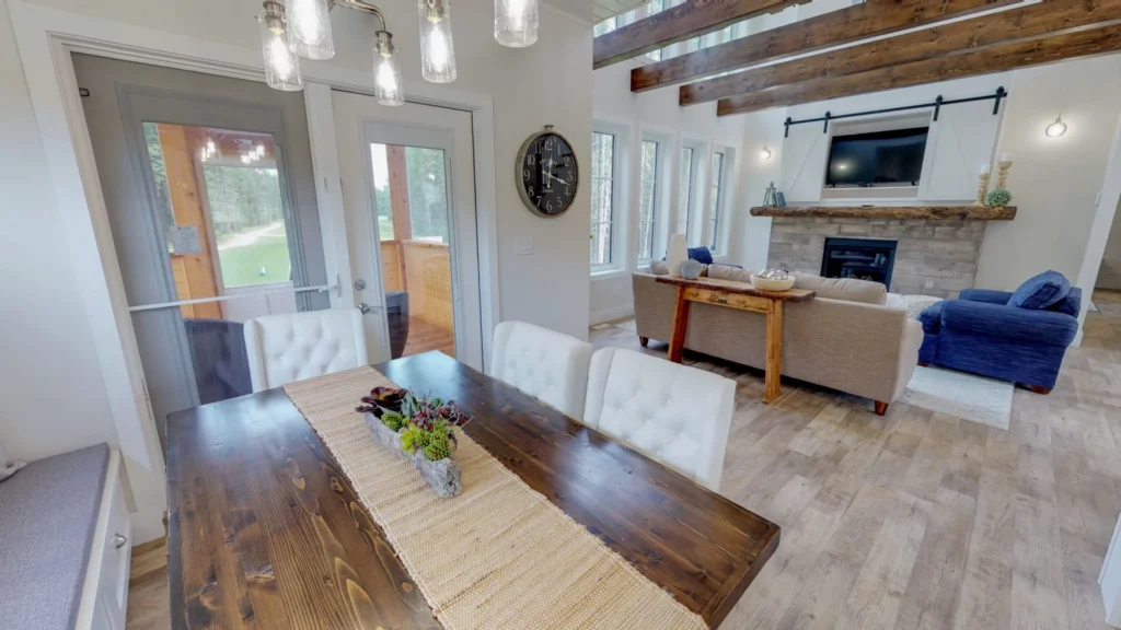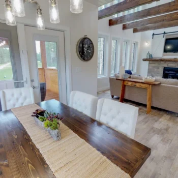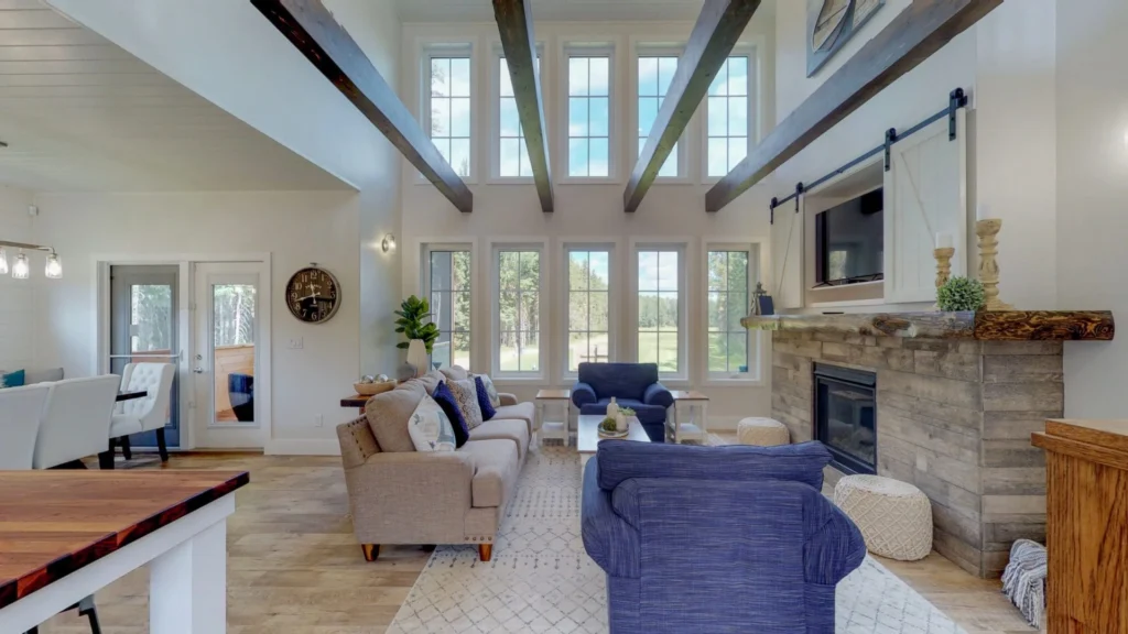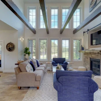 Stunning interior design features include elegant wood beams, a cathedral ceiling and two stories of picture windows to let in both the light and the scenery.