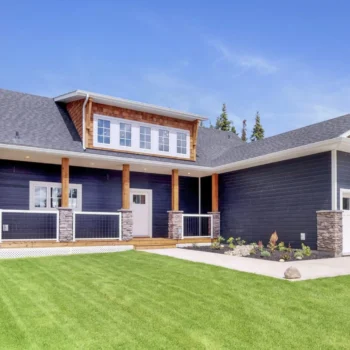 A balance of wood and brick ensures this home building design fits in anywhere—suburb, acreage, farm, forest or lake. A large attached garage and screened-in porch make this pre-built home ideal for year-round use.