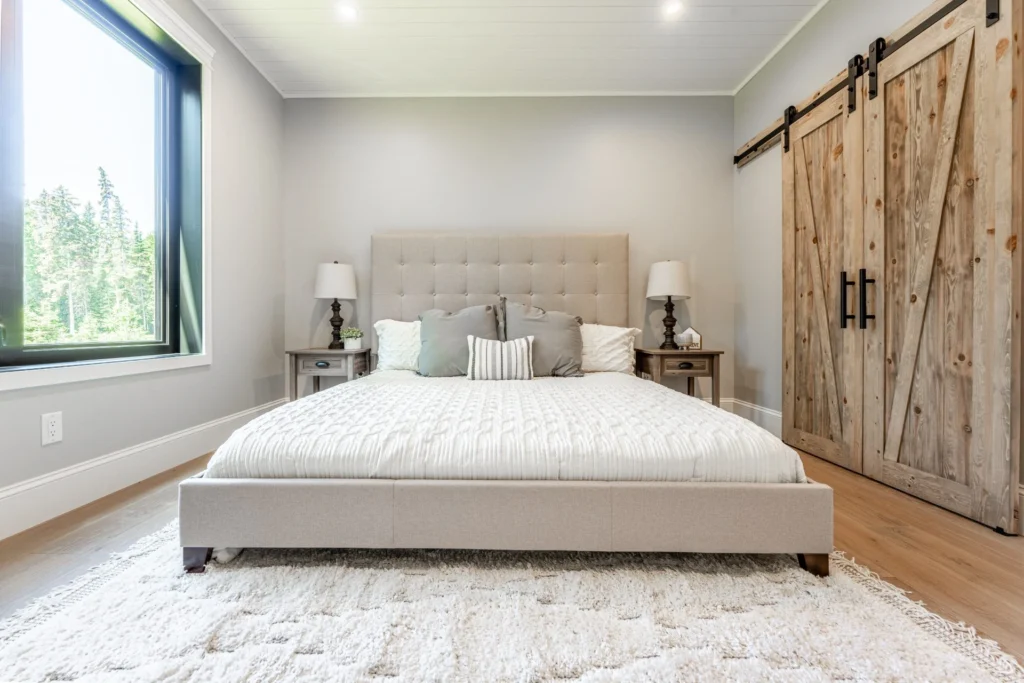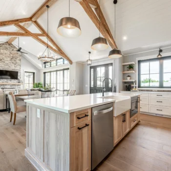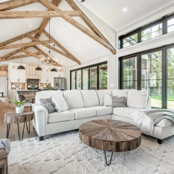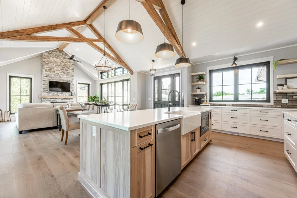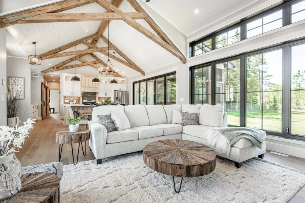 • Light-filled open concept farmhouse kitchen, elegant dining area and great room with impressive vaulted ceilings with spruce wood trusses