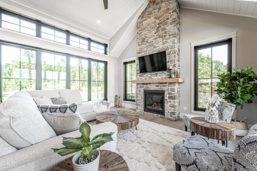 • Gas fireplace with floor-to-ceiling stone chimney
