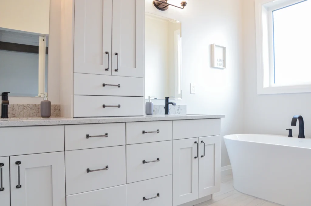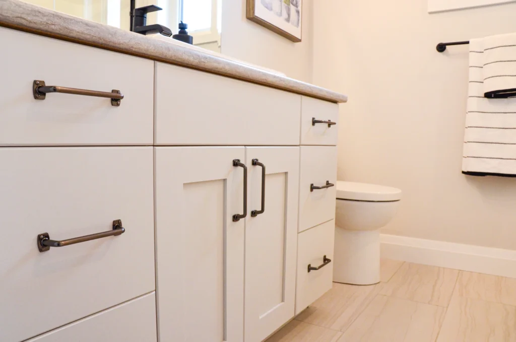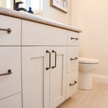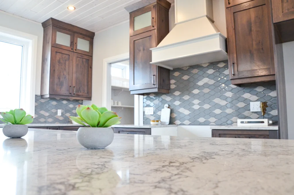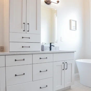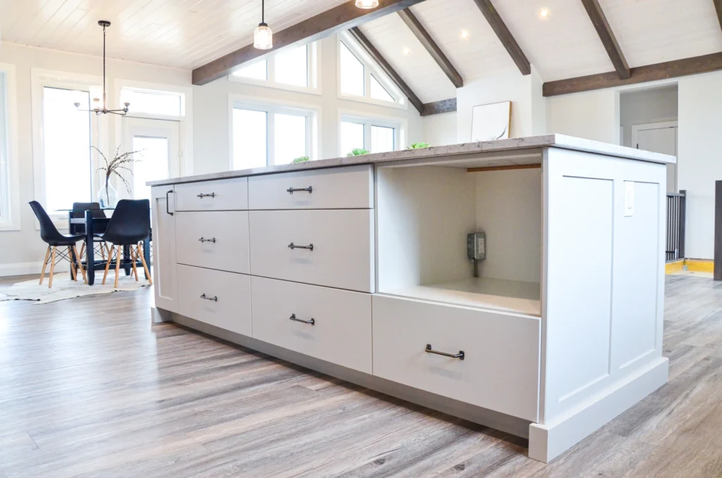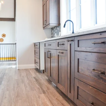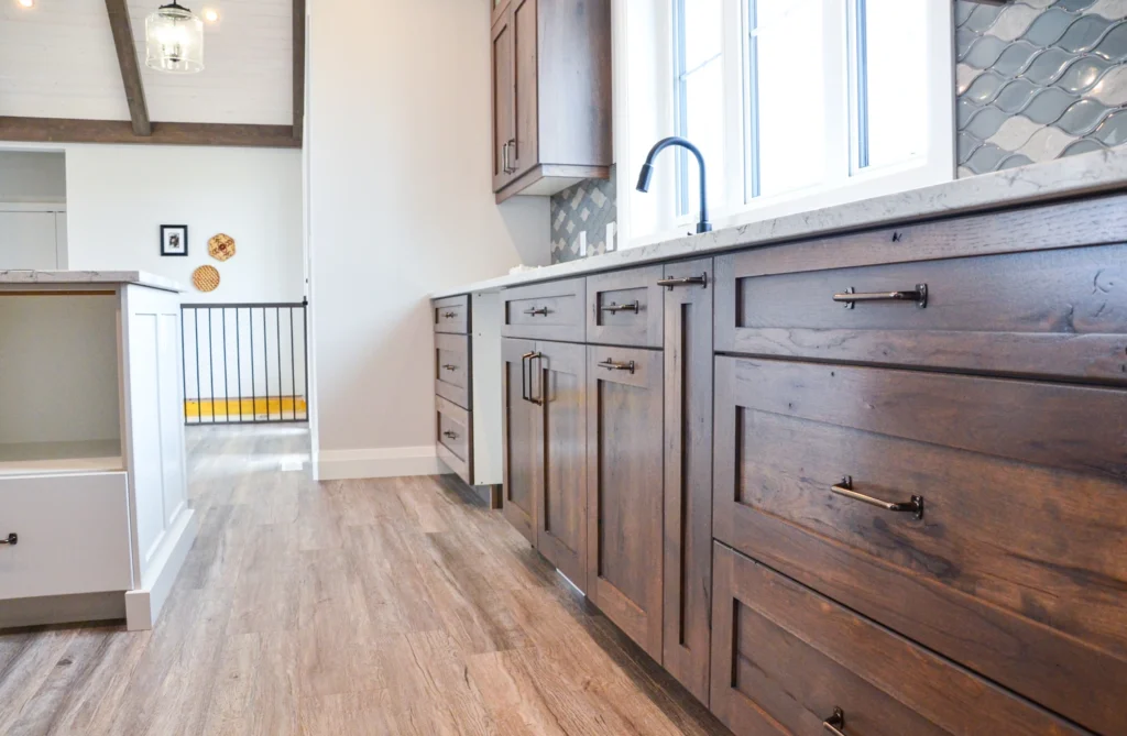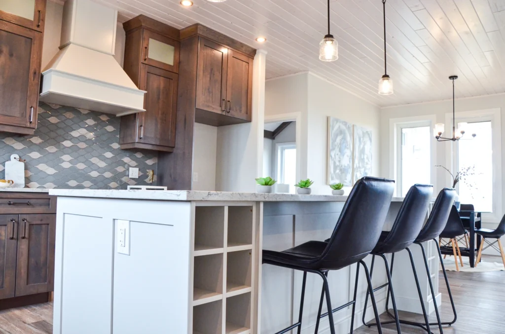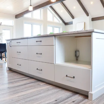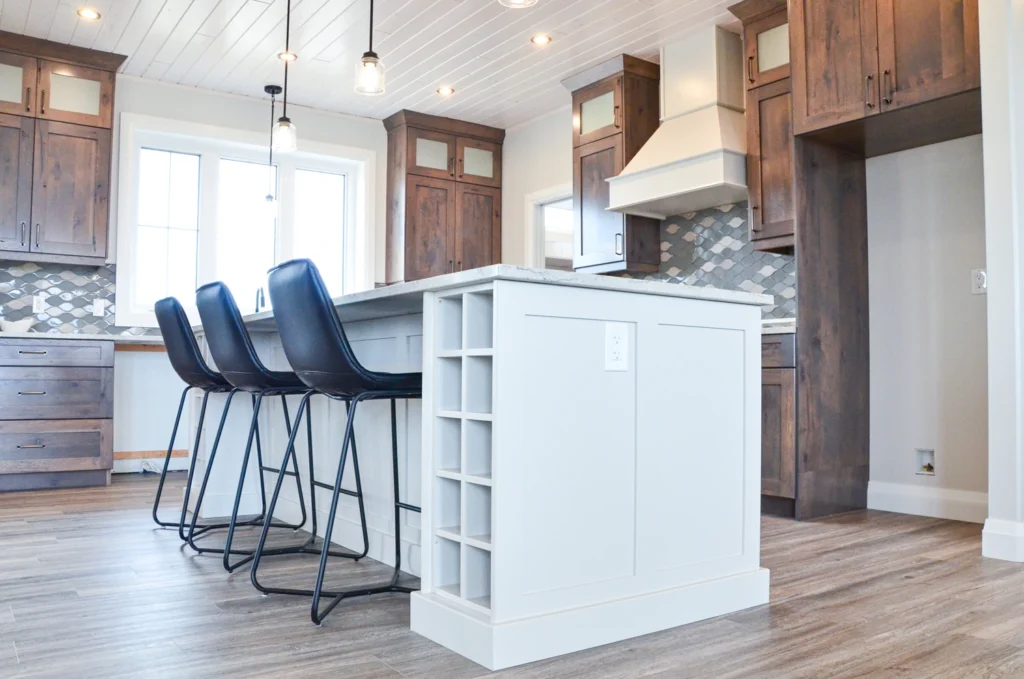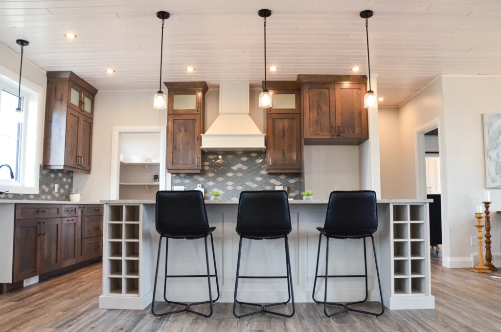 The farmhouse kitchen is currently one of the most sought-after designs in cabinetry! Simple additions such as paneling, built in wine racks, ceiling-height cabinets and a custom hood range elevate this design from classic kitchen to farmhouse charm.