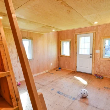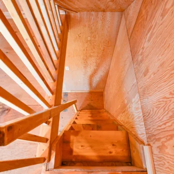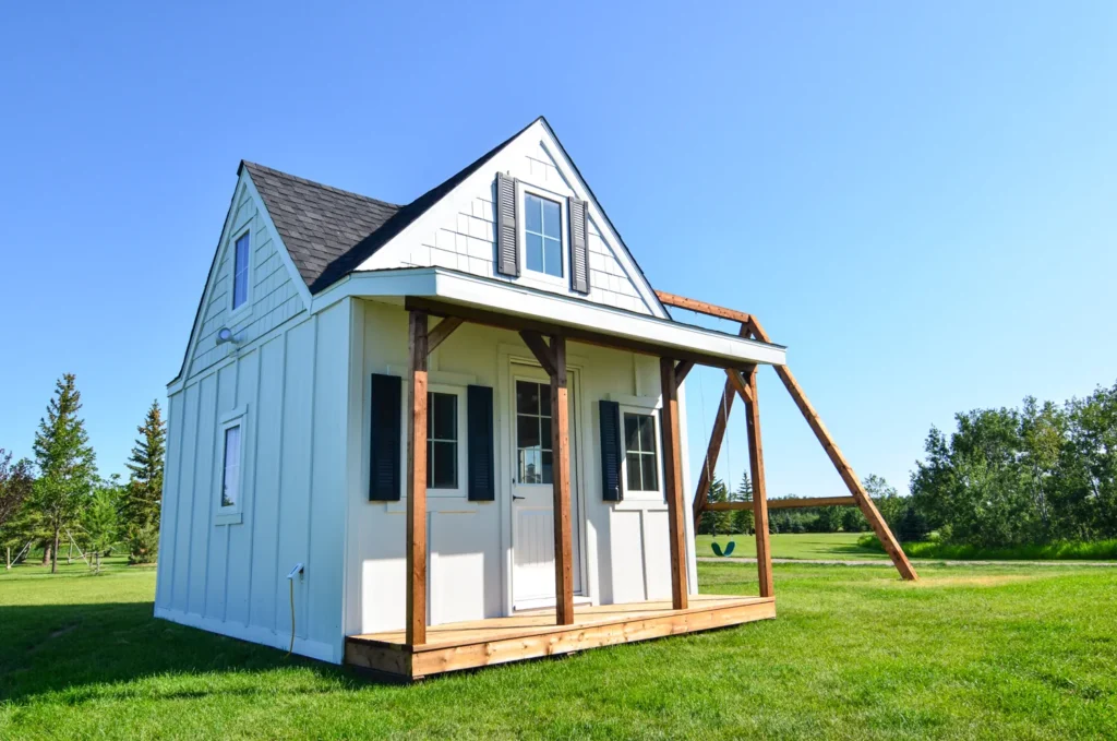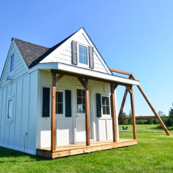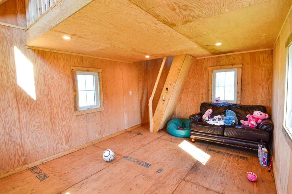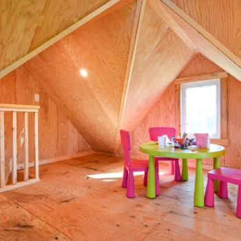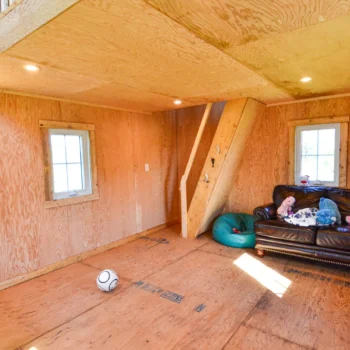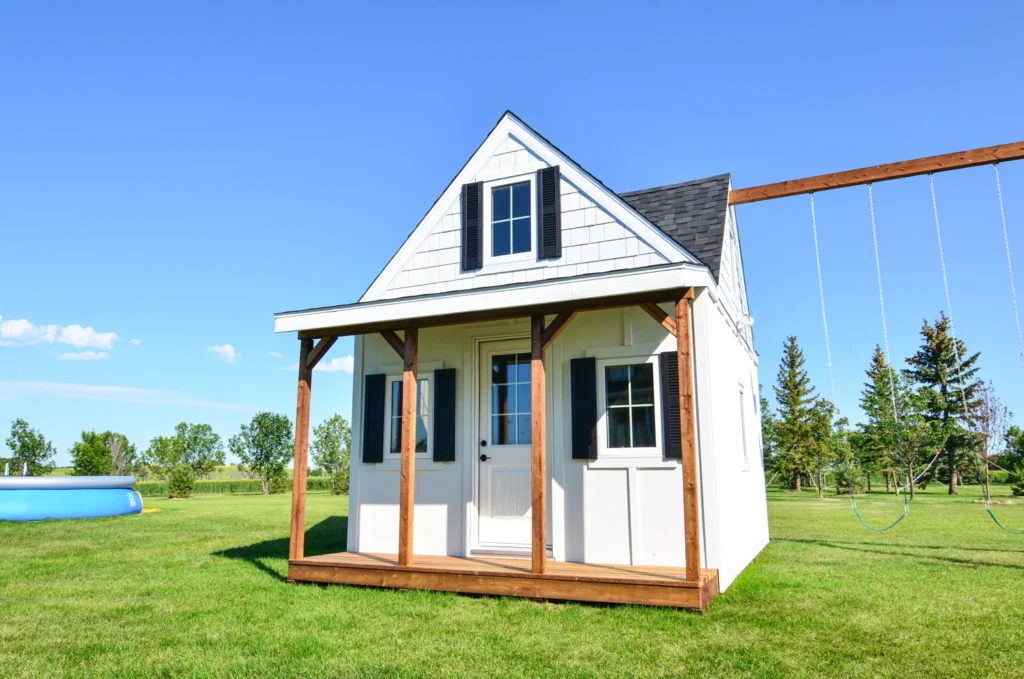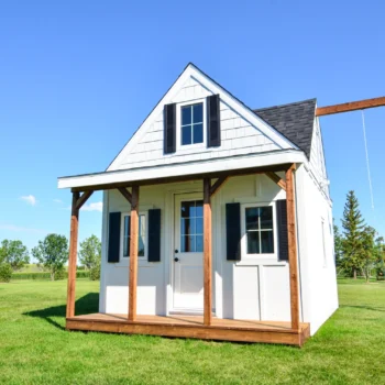 This stunning 192 sq. ft. playhouse is bigger than your average playhouse! Plenty of room for the kids and their friends, craft time, sleepovers, and more. This unit has lighting and electricity, so the kids can play the night away! This perfect mini-retreat house is paired with a little front covered porch and an attached swing set.