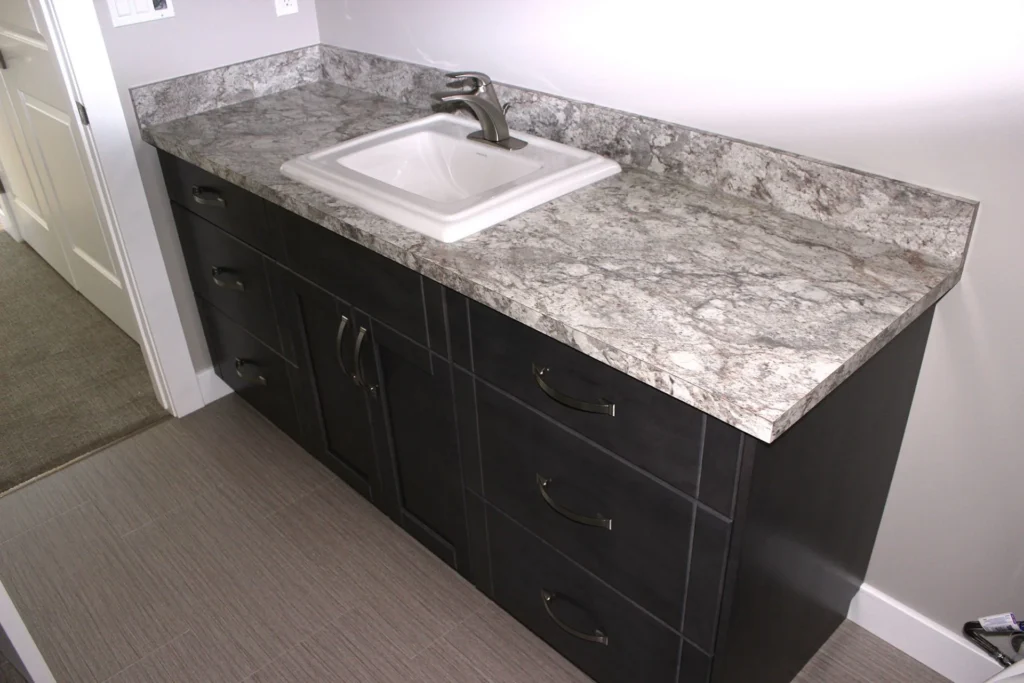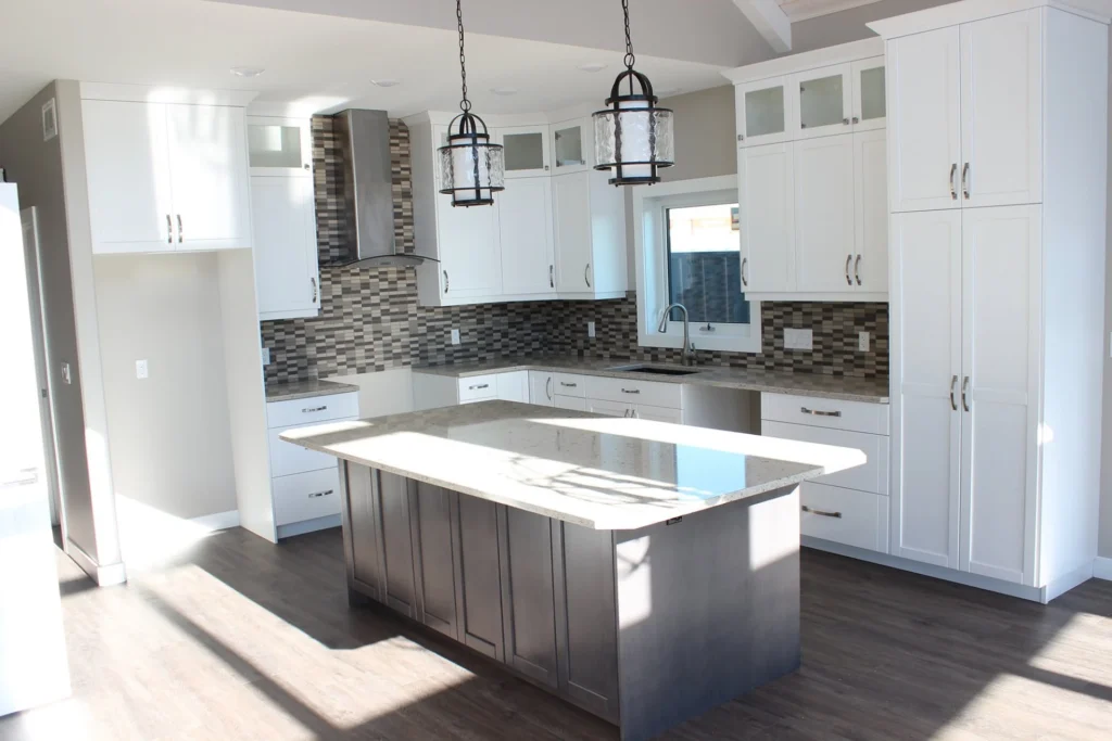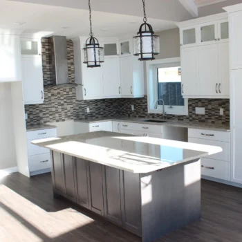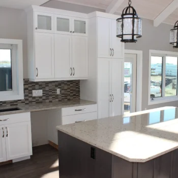 • Quartz countertops and custom cabinets in kitchen & bathrooms