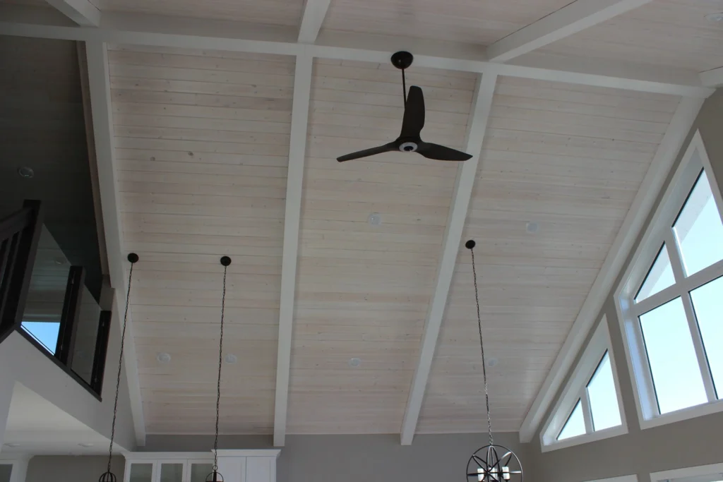 • Elegant black accents on stair railing, ceiling fan and light fixtures